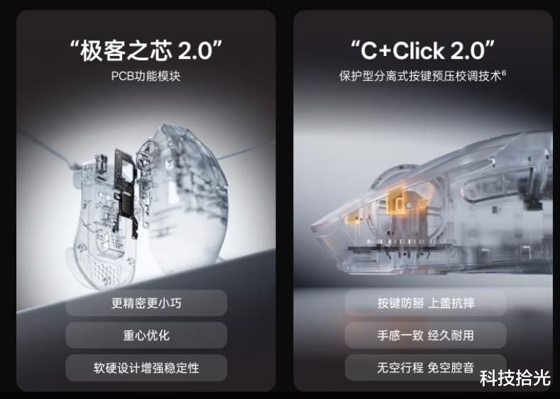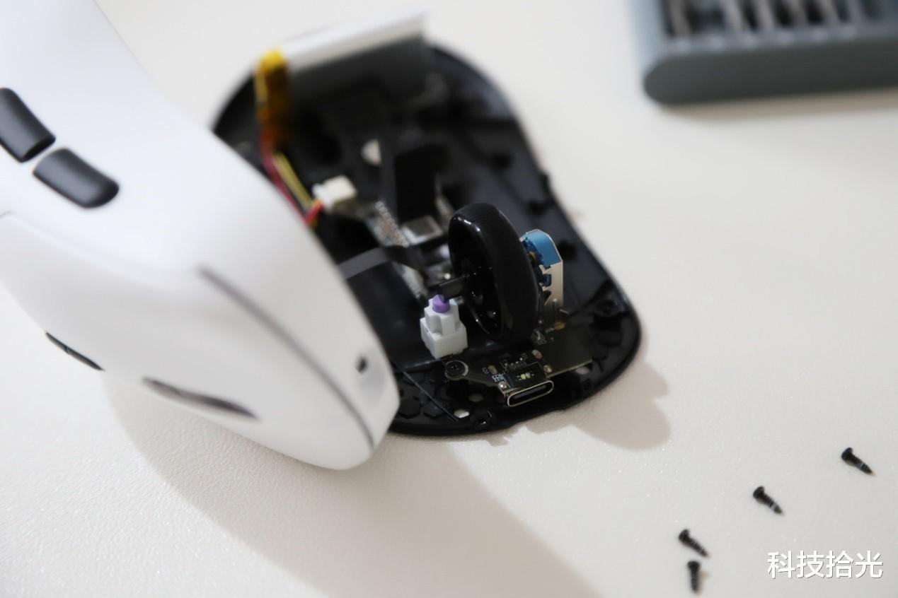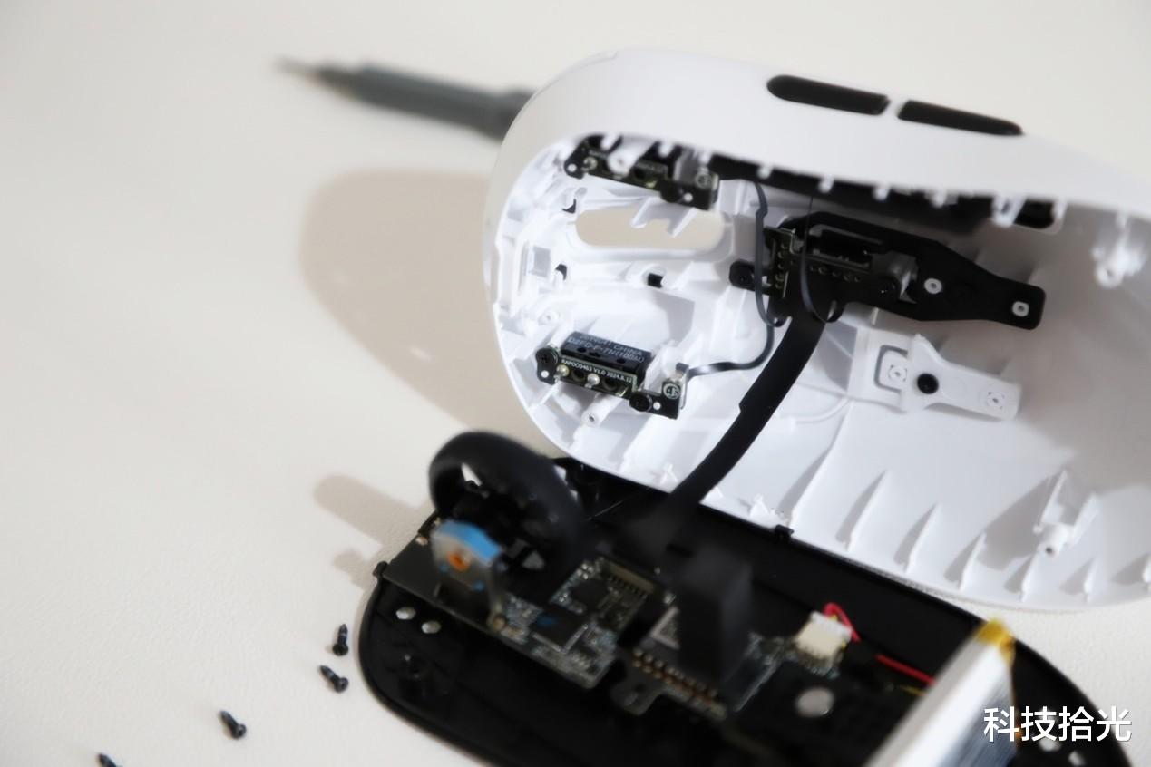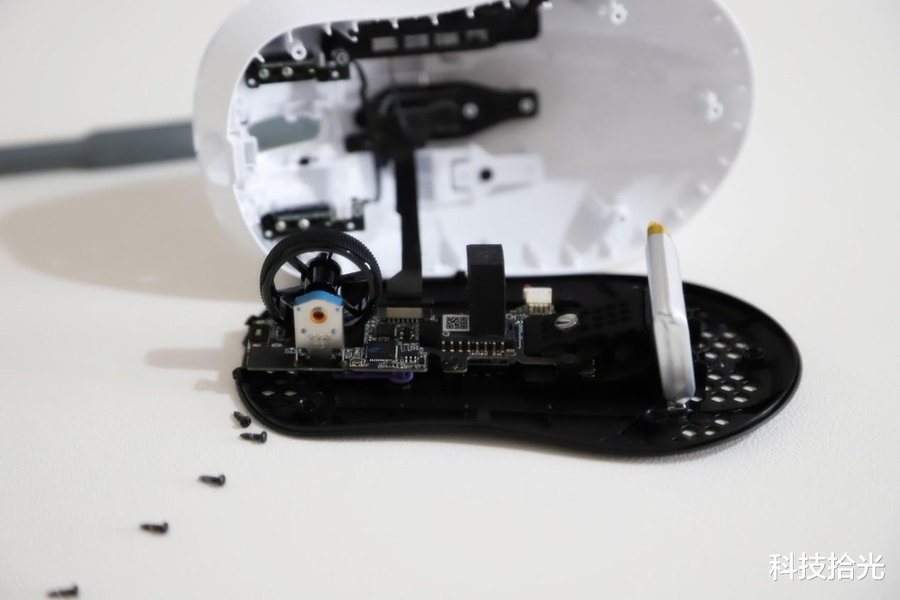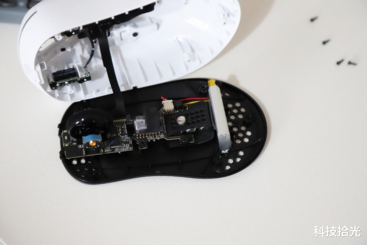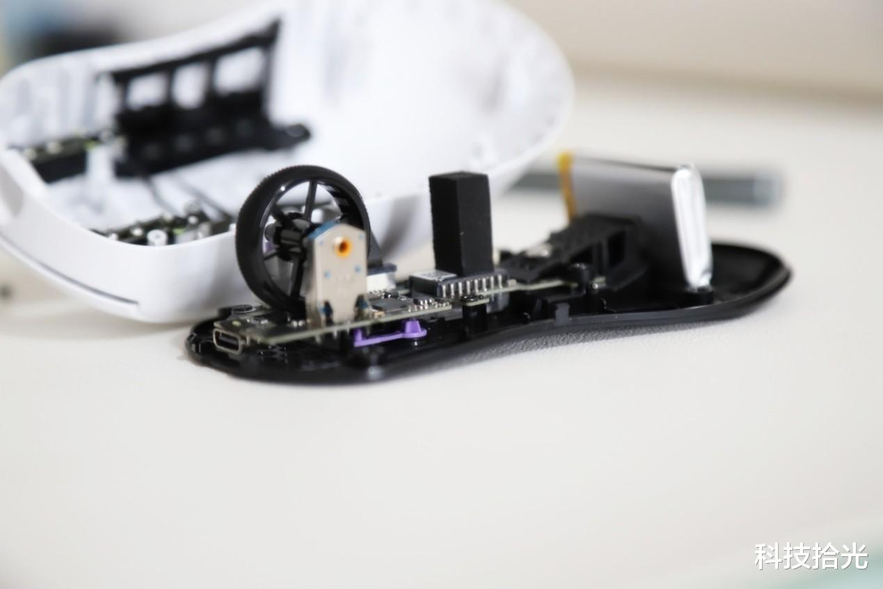 拆开鼠标后可以看到PCB功能模块更加小巧,同时也优化了重心,保持轻量化的同时,大大提升产品在使用过程中的稳定性。