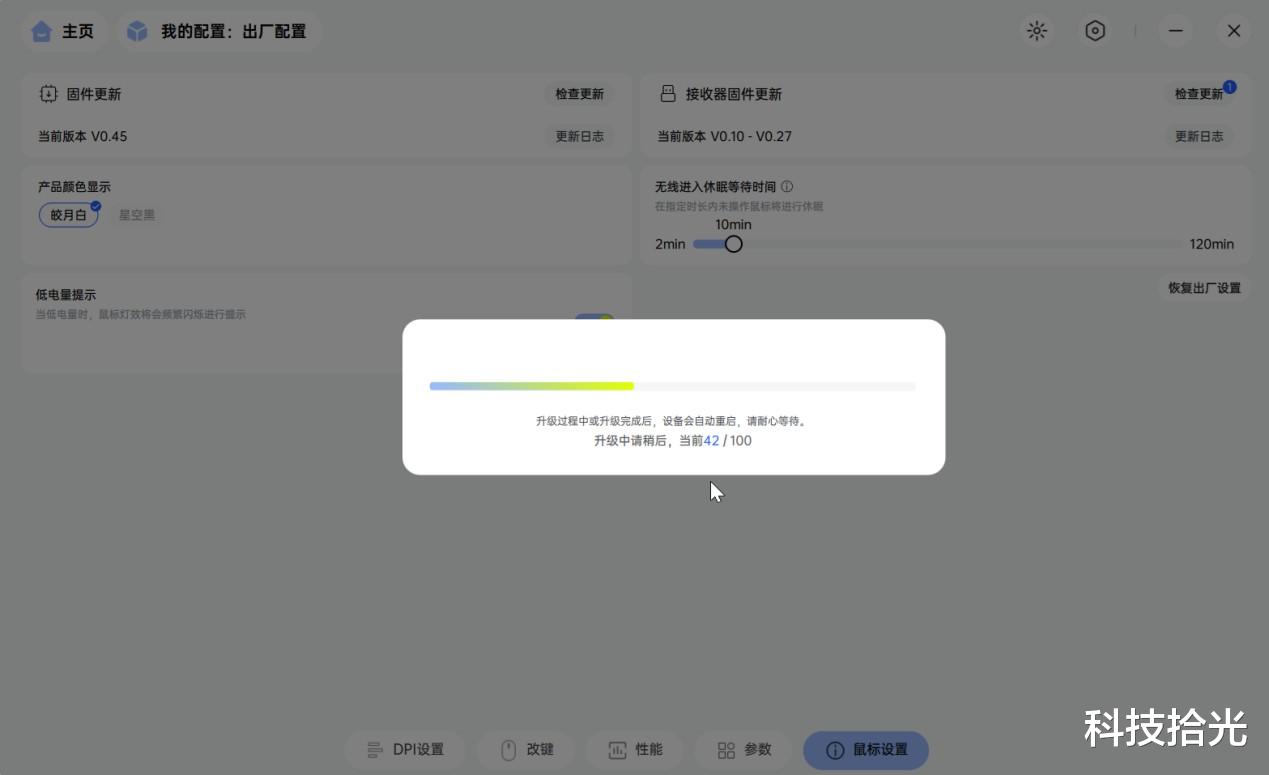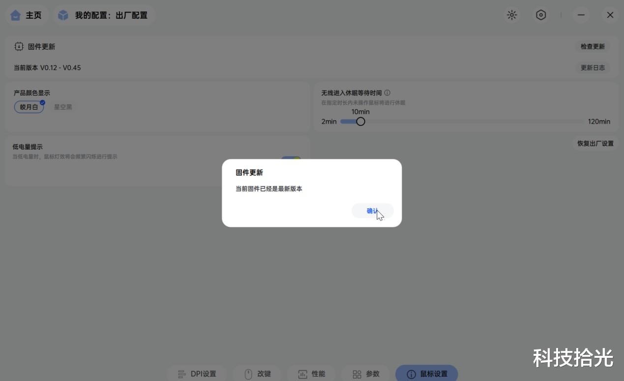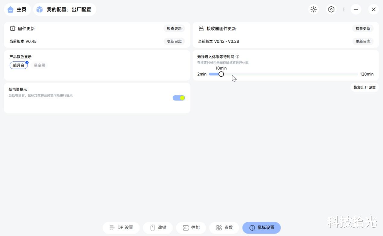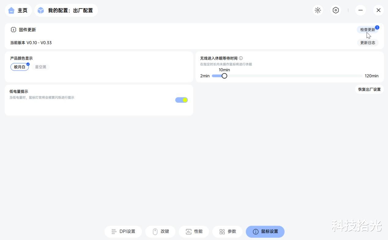 可以在主页查看鼠标电量,还可以进行接收器固件更新等操作。