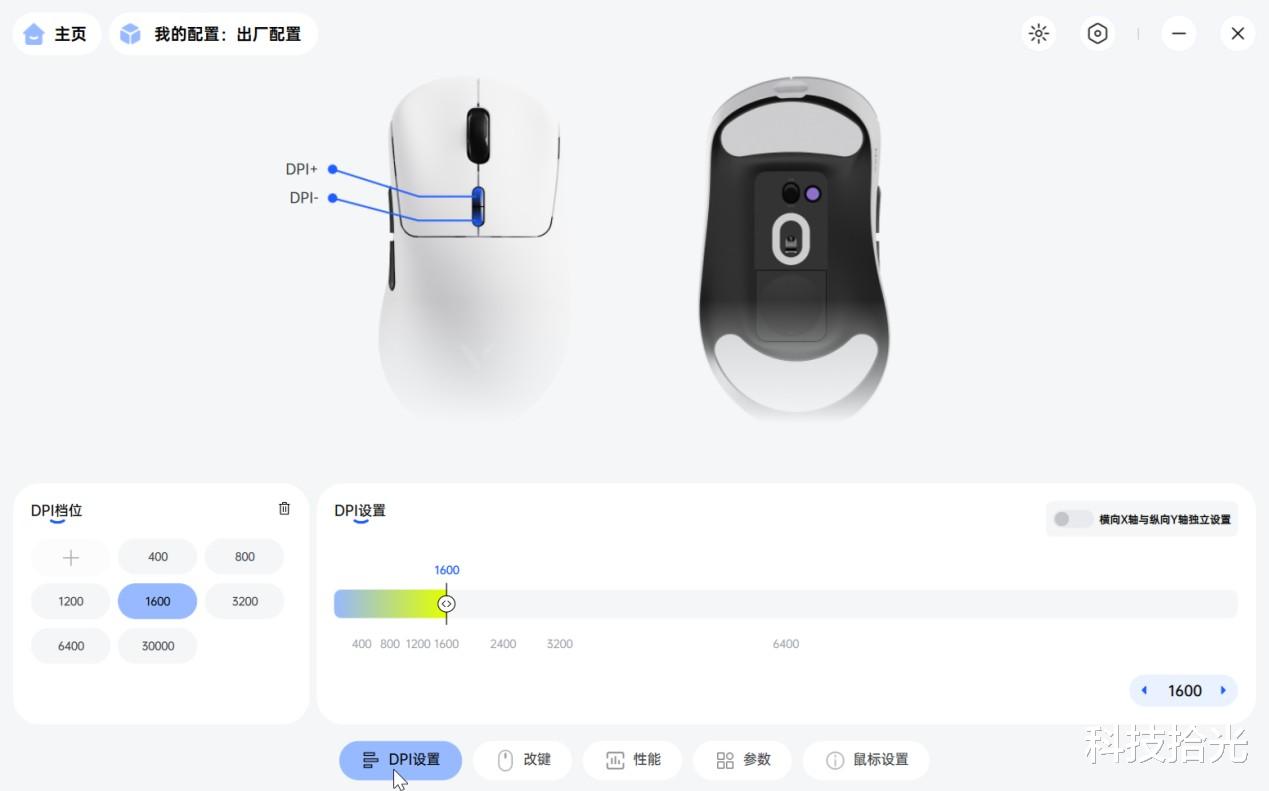 在DPI设置界面,可以看到支持10~45000自由DPI设置,默认配合鼠标顶部的DPI快捷调节按键,可以轻松实现不同游戏不同显示器上的快速DPI调节(VT3标准版二代支持调节为50~26000)。另外针对FPS玩家还可以开启横向X轴与纵向Y轴的独立设置,可以帮助玩家在不同比例显示器上找回相同的手感,非常强悍!