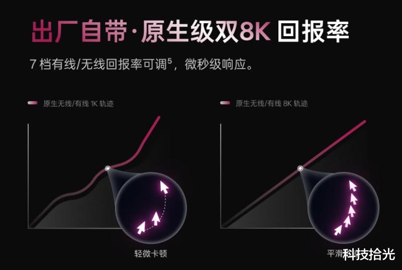 当你设置到无线8K回报率时,你会感觉鼠标和光标似乎如影随形,粘在了一起的感觉。那种十分贴紧的手感,欲罢不能!当然开启8KHz回报率确实对鼠标续航有较大的减少,同时对笔记本的CPU功耗有提升。但是在玩FPS类游戏时,那种丝滑的手感,也可以实实在在的提升游戏玩家的手感甚至是玩家状态,助力取得更好的成绩。