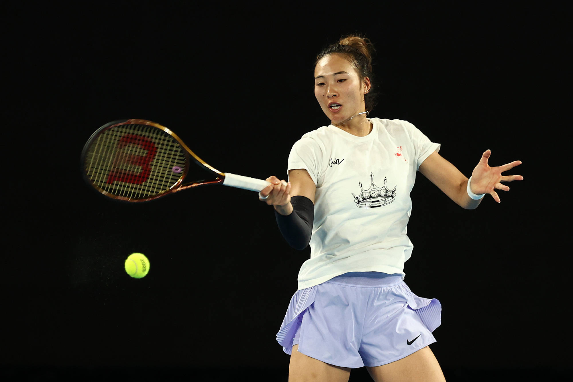 郑钦文穿着白色的T恤,上面印有王冠的图案,还有“Queen Wen”的字样,搭配浅紫色的训练短裤。