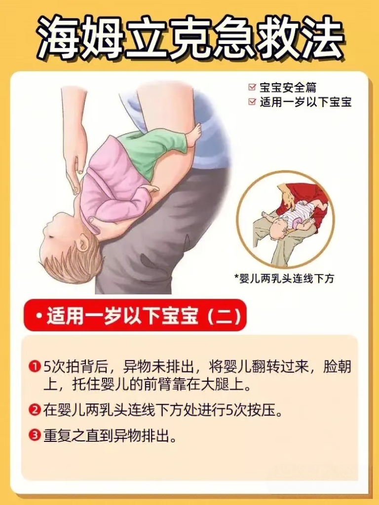 · 重复: 重复“5次拍背+5次压胸”,直到异物吐出或宝宝能正常呼吸哭喊。
