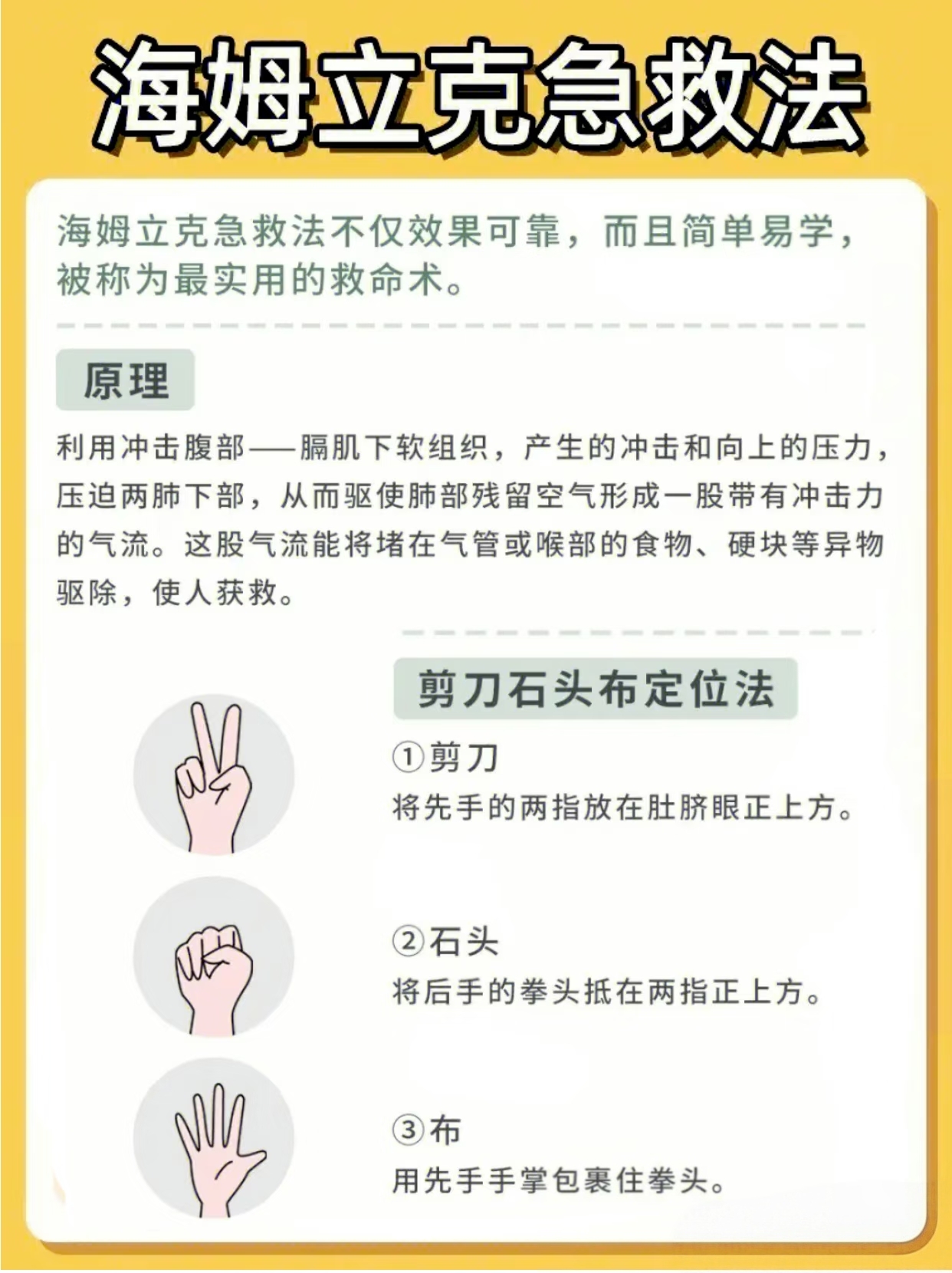 · 石头: 一手握拳。左手握拳,拳眼对准我们刚才找到的“剪刀”位置,也就是肚脐以上、胸骨以下的腹部。