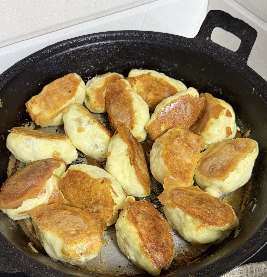 4. 不会捏褶?对折捏紧成半月形,照样能煎出金黄脆底