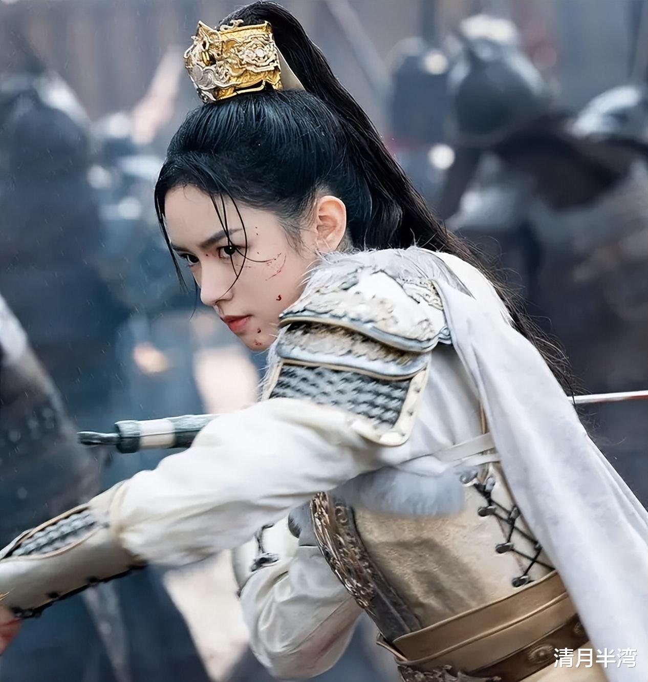 2017年,顶着张甜美小圆脸、扎高马尾的赵丽颖,“眉眼有锋芒,不见脂粉气”,把女将军的英姿和气势都演了出来。