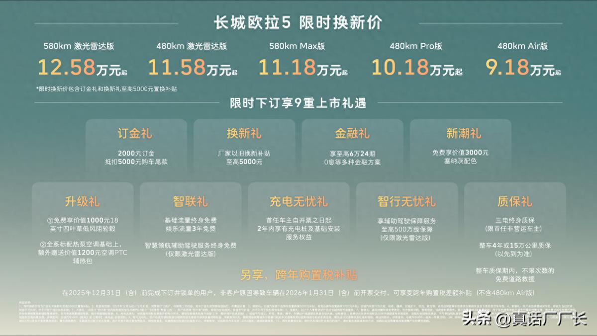 【中国·保定】2025年12月16日——今日,长城汽车欧拉品牌全新A级纯电SUV——长城欧拉5正式上市。新车共推出5款配置,建议零售价区间为 9.98万至13.38万元,限时换新价9.18万元起(限时换新价包含“订金礼”和“换新礼”至高5000元以旧换新补贴)。为回馈广大用户的热爱与支持,即日起至2025年12月31日,用户下订并锁单即可尊享包含订金礼、换新礼、智行无忧礼在内的9重上市好礼,以及跨年购置税补贴(不含480km Air版)等丰厚购车权益。凭借诚意十足的价格权益与越级产品力,长城欧拉5致力于成为全球年轻用户的“严选搭子”。