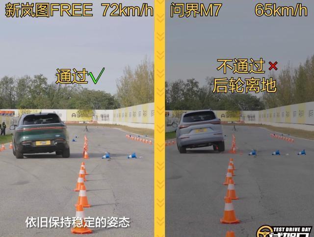 麋鹿测试往往是众多SUV车型面临的一大挑战,原因在于它们普遍拥有较高的重心、较长的悬架行程,这导致车身在测试中的动态姿态极难精准掌控。问界M7在进行麋鹿桩测试时,其通过速度达到了65km/h,但在这一过程中,车辆出现了轮胎暂时离地的状况,这一表现无疑揭示了其底盘在极限状态下的稳定性并不突出。