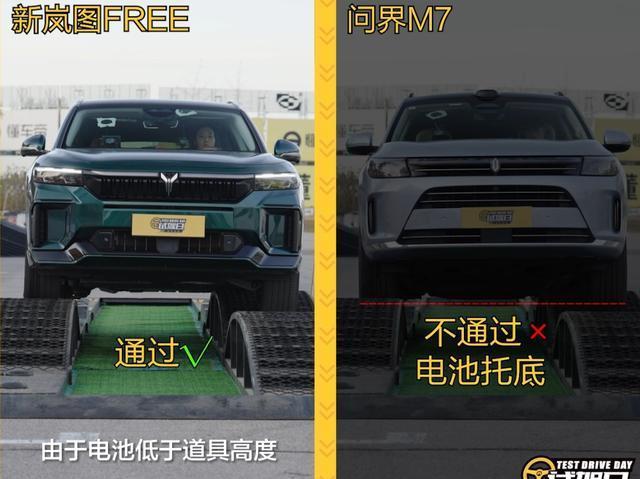 审视问界M7的表现,可谓是“步步惊心”。缺乏空气悬挂无疑是其一大短板,加之底盘设计偏于柔软,导致问界M7的悬架系统极易受到压缩,甚至发生了电池包位置低于地面障碍物的尴尬情形。在越野性能的较量中,它与新岚图FREE之间存在着显著的鸿沟。即便是转移到城市道路的简单场景,比如跨越路缘石这样的日常操作,相较于新岚图FREE的游刃有余,问界M7也不得不慎之又慎,毕竟一旦电池包受损,“后果将不堪设想”!