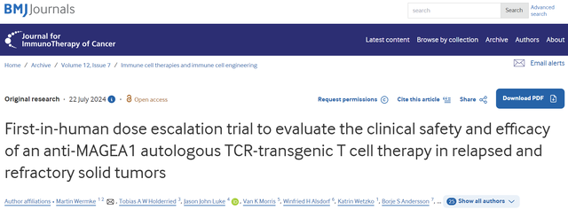 2024年7月,美国MD安德森癌症研究中心以及德国汉堡大学附属埃彭多夫医院等多位研究人员在《Journal forImmunoTherapy of Cancer》发表了抗MAGEA1自体TCR转基因T细胞疗法在MAGEA1阳性复发性和难治性实体瘤中的临床安全性和疗效的首次人体剂量递增试验结果。