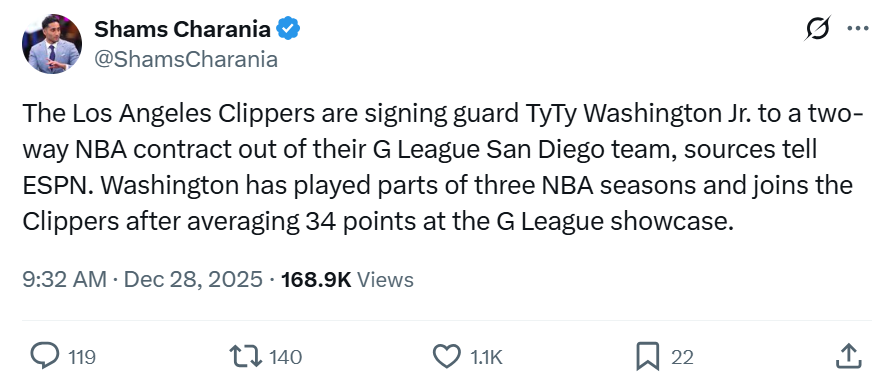 根据ESPN名记Shams报道,快船队将与泰泰华盛顿签下一份双向合同。