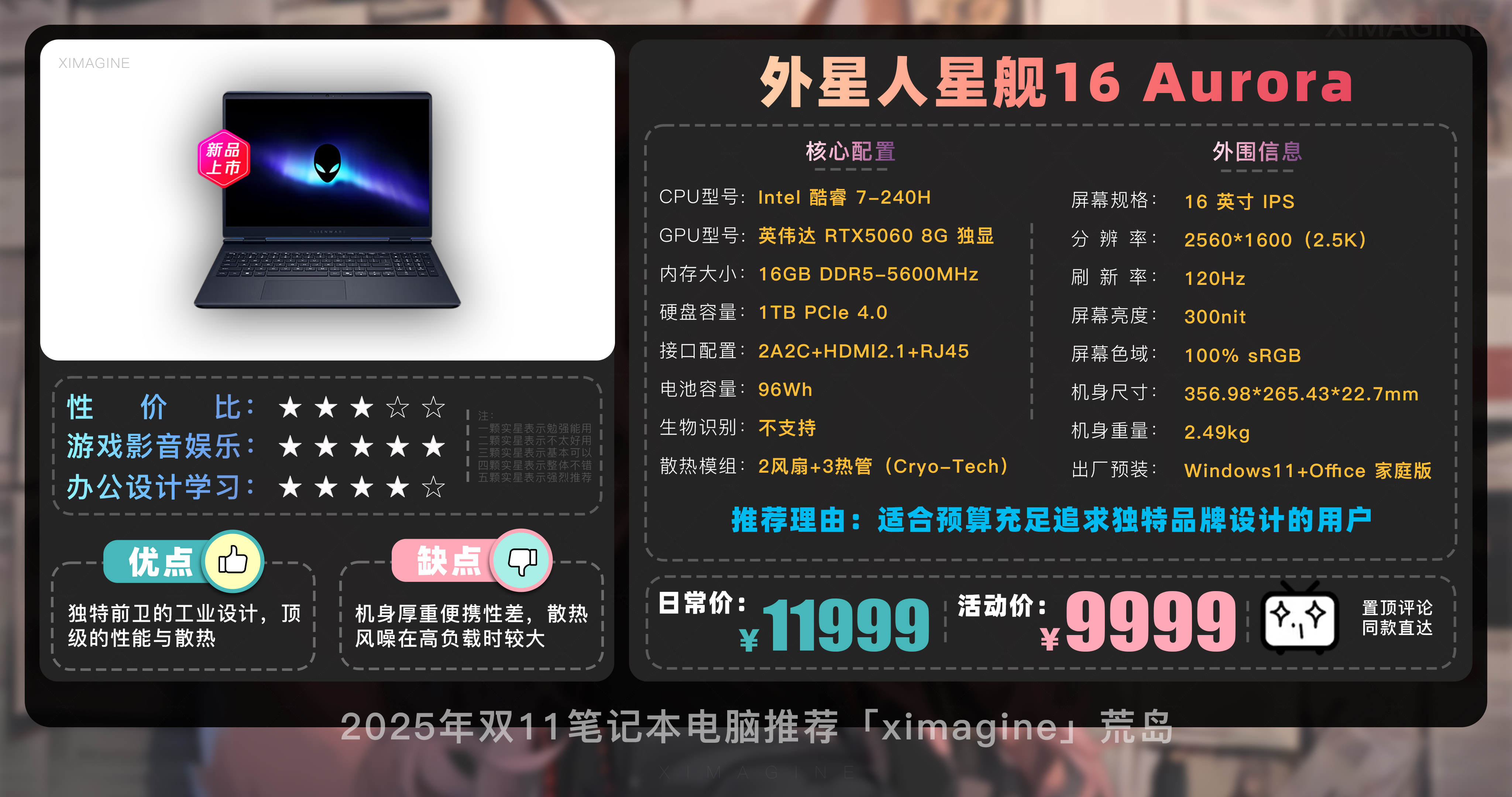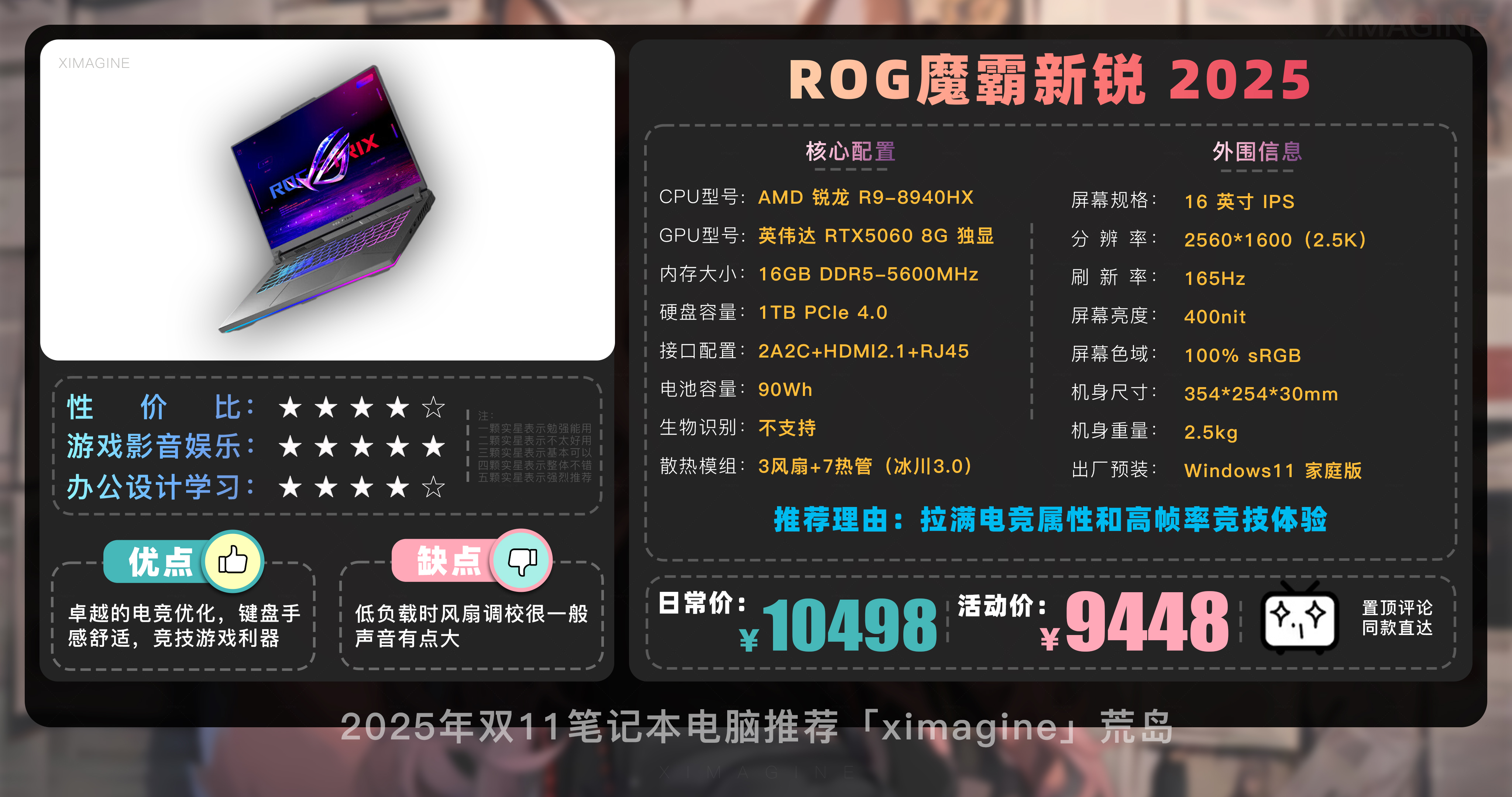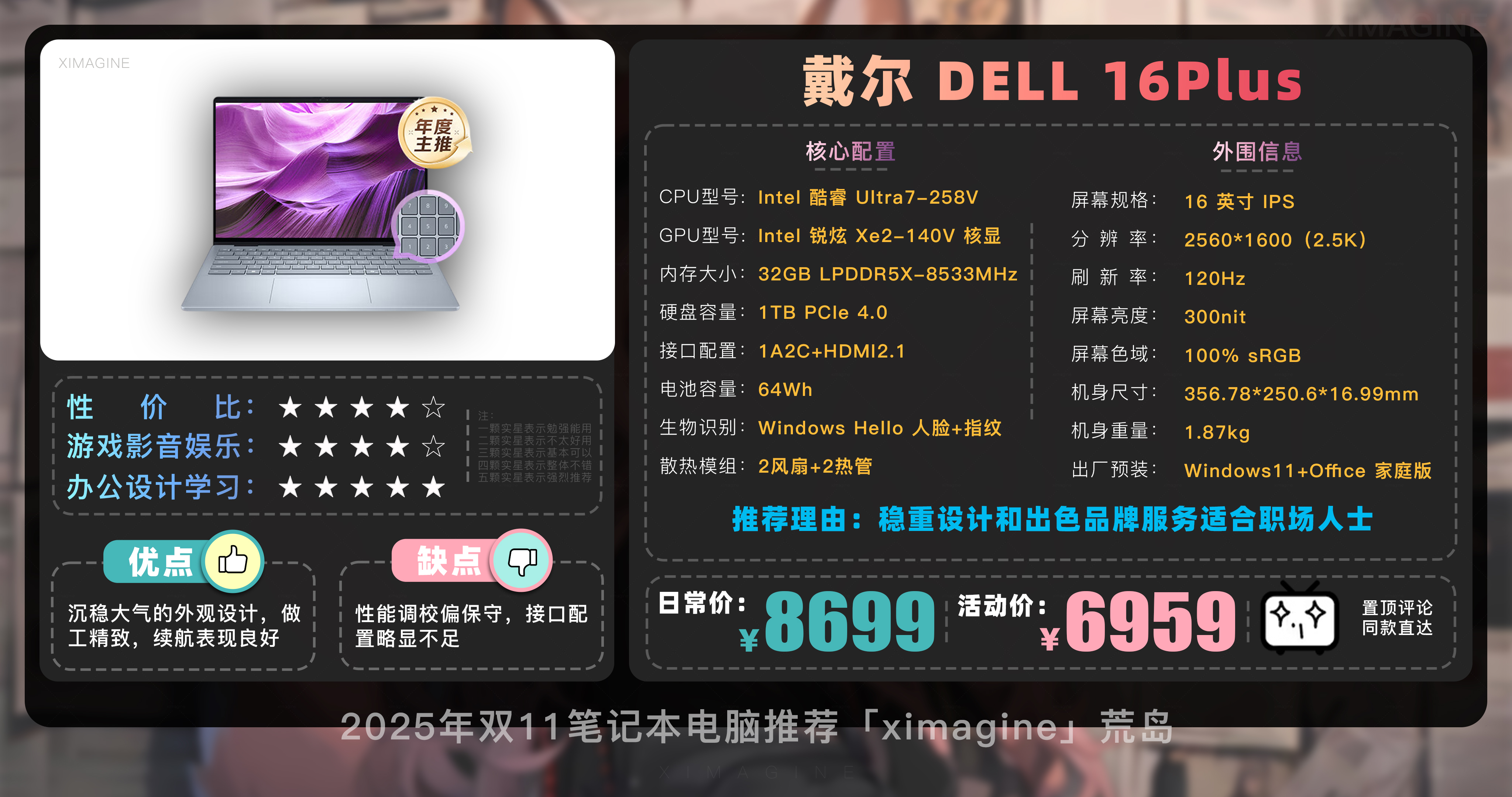 欢迎来到2025年双11笔记本电脑推荐合集!我是「ximagine」本期19款笔记本电脑涵盖了7款游戏本、7款全能本和5款轻薄本,我已经替大家汇总了优缺点、场景体验和三维度评分,就是为了帮你找到适合自己的游戏办公搭子!选购笔记本电脑只要记住这3点就不会踩坑,第一看需求:如果你主玩大型3A游戏或做生产力高负载渲染,预算优先给独显;如果主要做设计或视频,预算优先给广色域屏幕和内存;如果只是日常办公学习,预算优先给轻薄和长续航。第二看屏幕: 无论是哪个类型需求,都尽量选择高分辨率、广色域的屏幕,游戏玩家看刷新率和响应时间;内容创作者看色准和色域。第三看散热: 对于高性能机型,散热模具和风噪控制比堆砌参数更重要,它决定了性能能否稳定释放。另外好消息是双11活动已全面开启,部分机型还能叠加国补,坏消息是不太好领;不过我觉得这个时间点购买还是能以划算的价格实现配置毕业!话不多说,正餐开始!