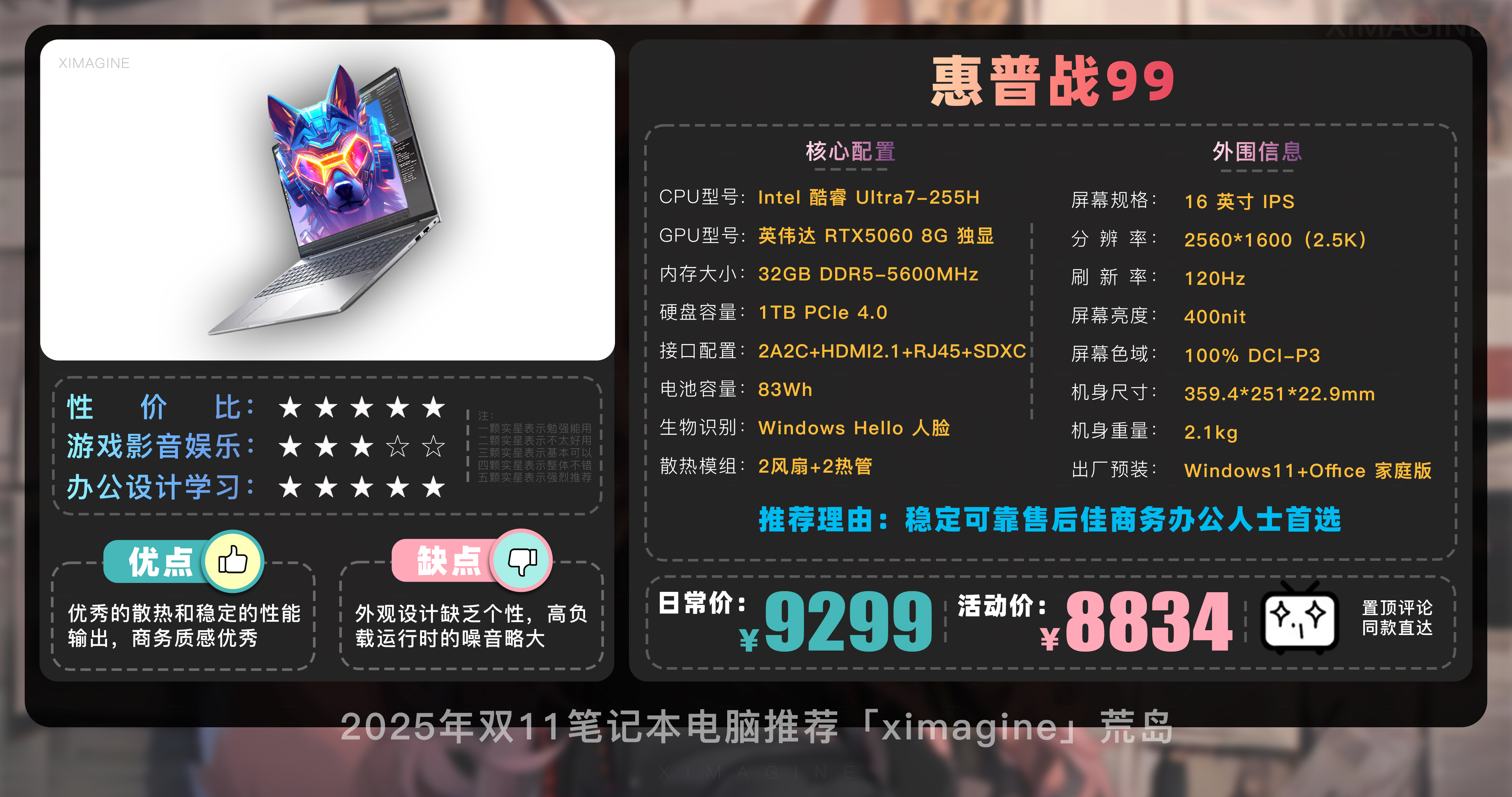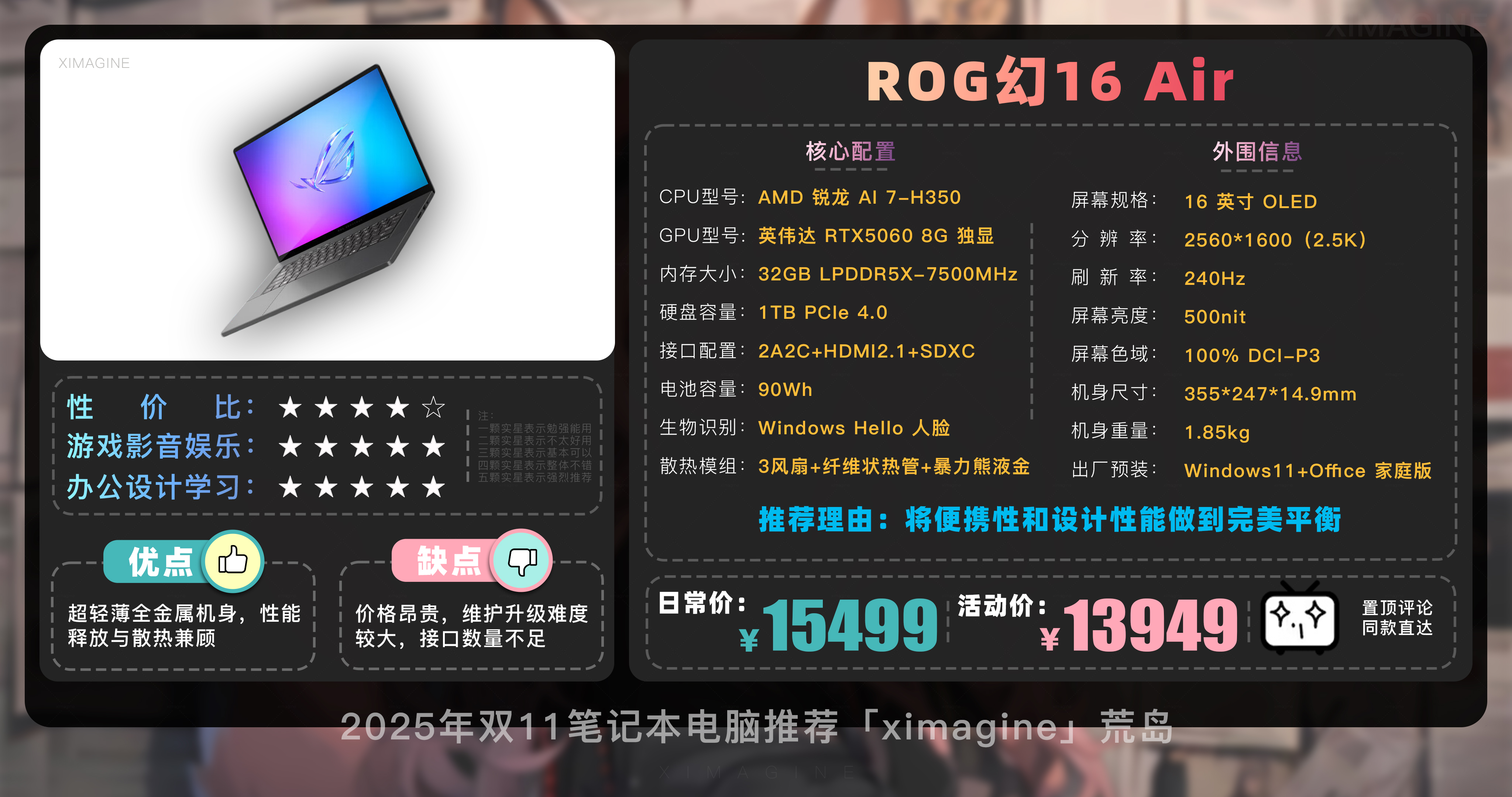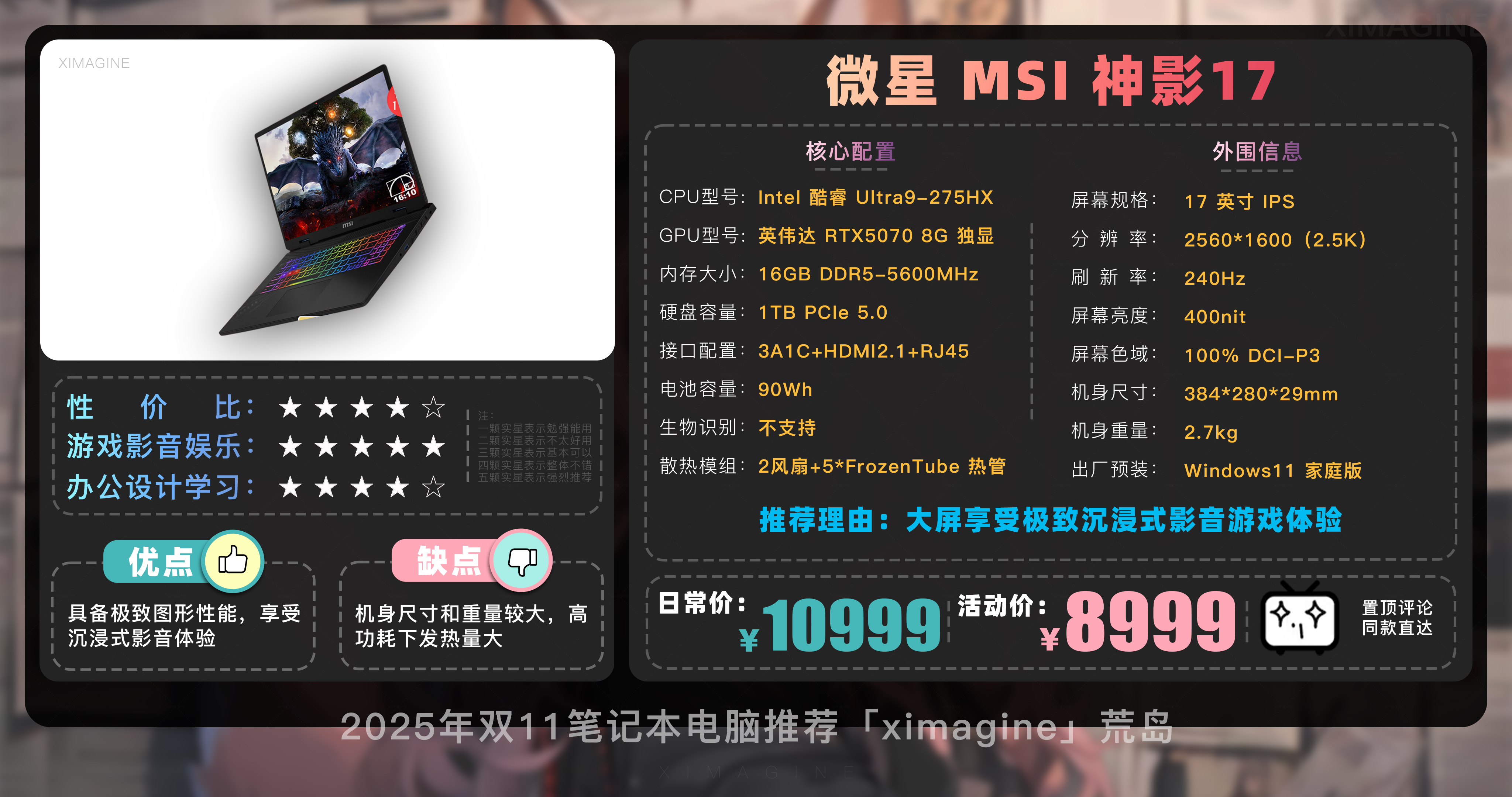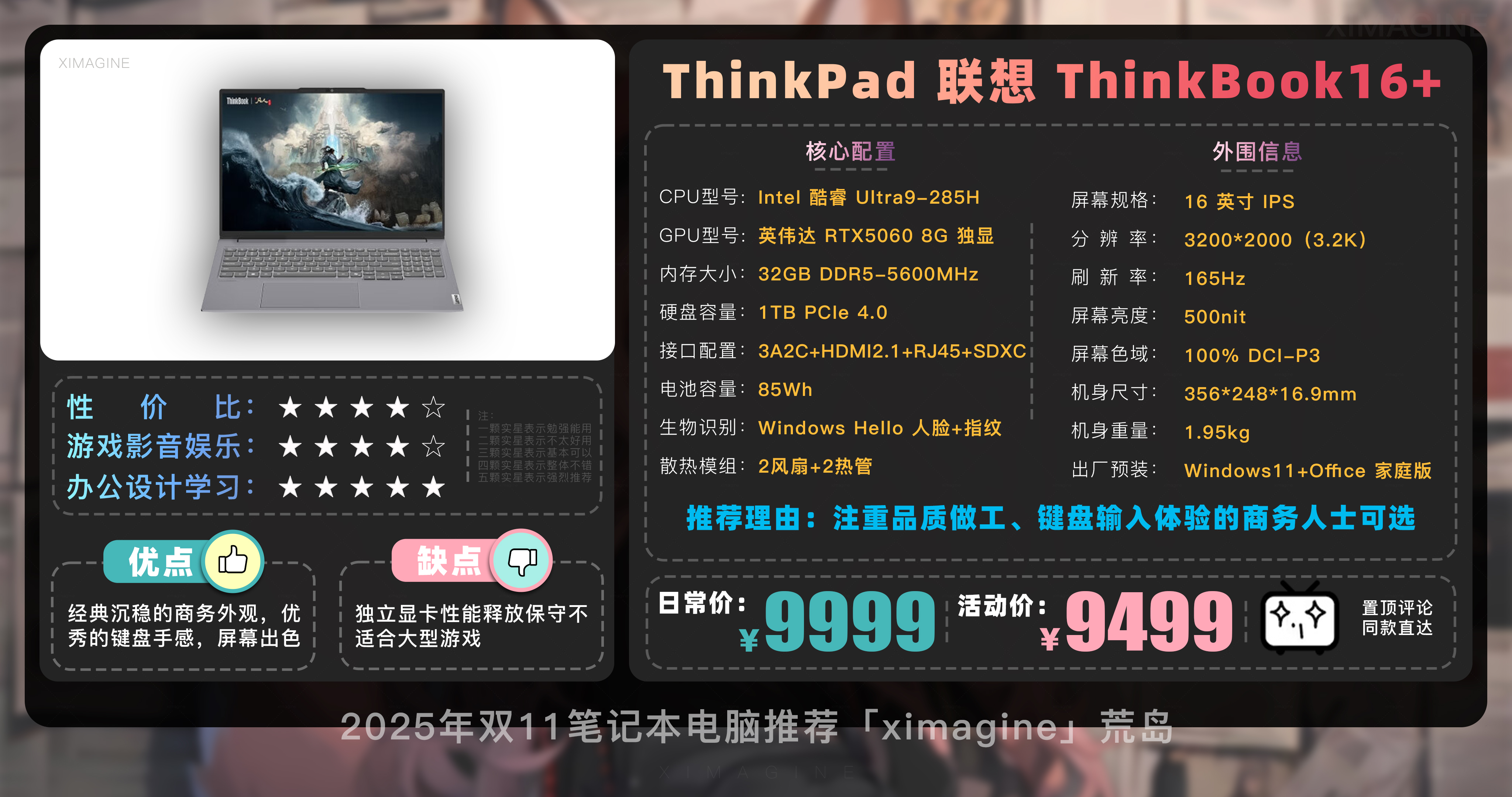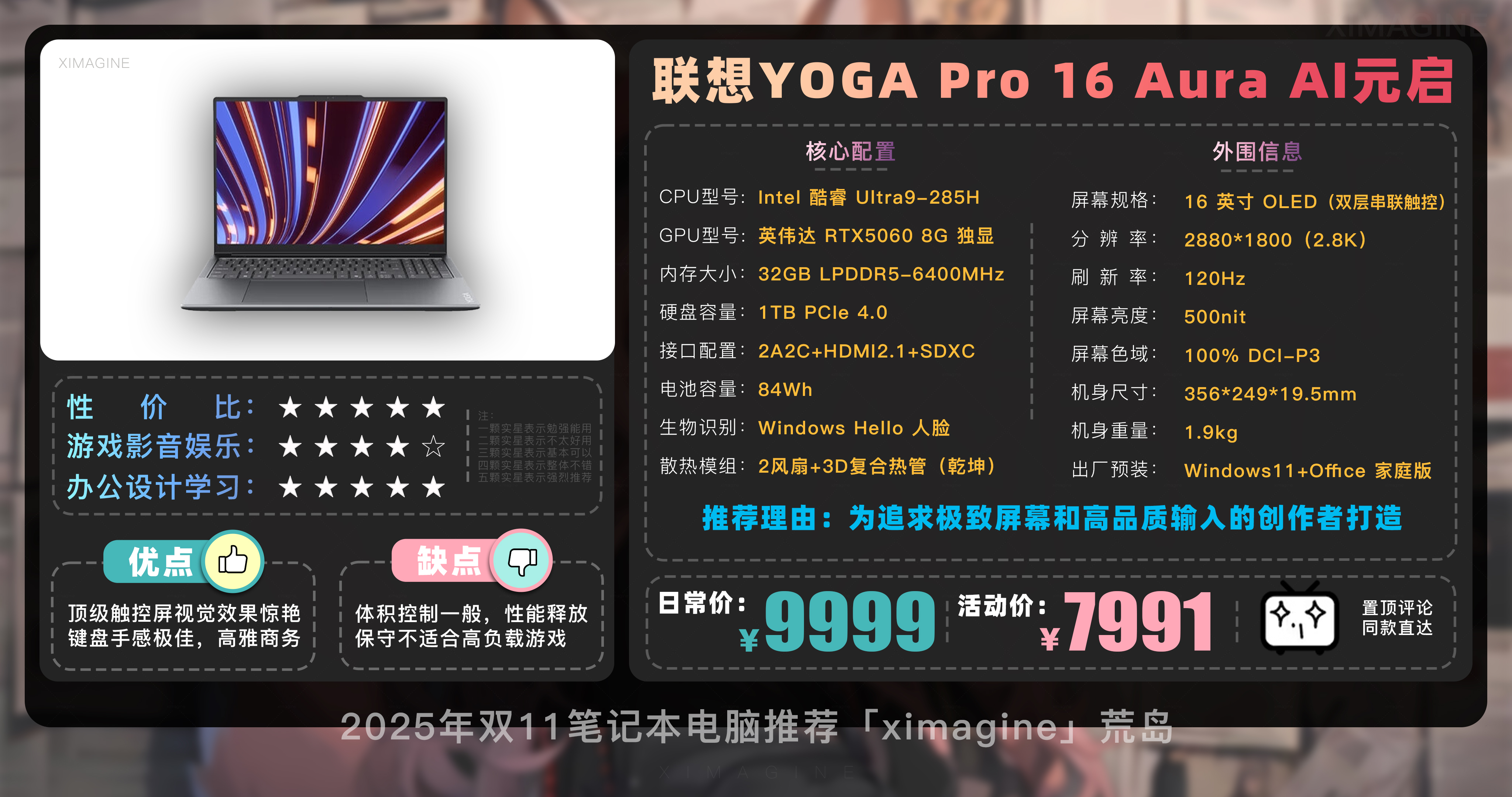 以上就是2025年双11笔记本电脑推荐清单,从性能怪兽的游戏本,到均衡创作的全能本,以及便携的轻薄本,每款笔电都有它的优缺点,希望我的三维度评分和体验总结,能帮你彻底理清选购思路,如果有你心水的机型,趁双11期间平台优惠力度不错,可以戳置顶评论区对应链接拿下。本期就到这,如果觉得内容有所帮助,请三连支持!我是「ximagine」,下期再会!