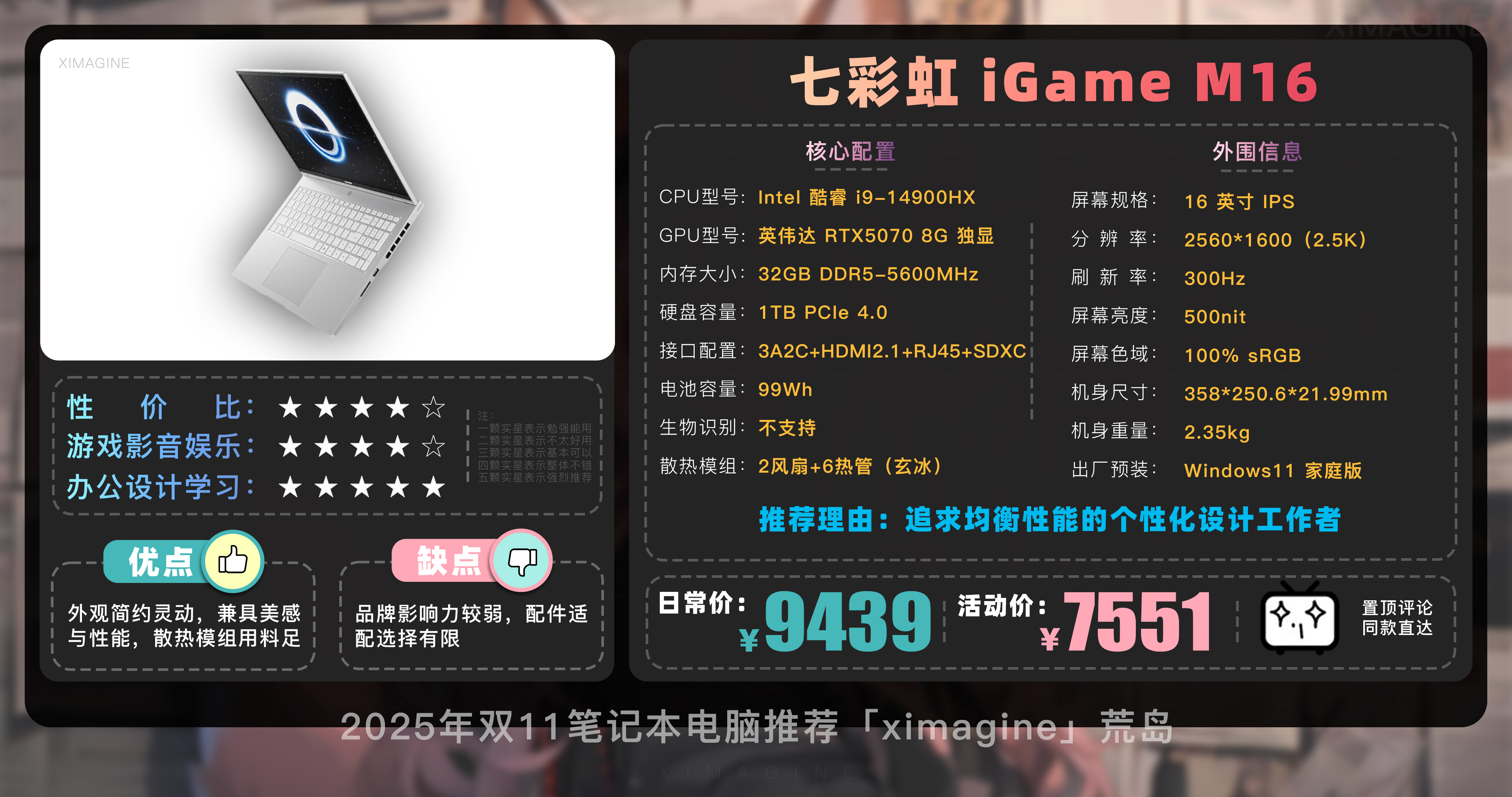 七彩虹 iGame M16 给我的体验是其简约外观下蕴含的强大力量。采用了具有设计感的模具,摆脱了传统游戏本的刻板印象,做工质感优秀。它在轻薄化的机身中实现了出色的性能释放,酷睿i9-14900HX搭配RTX5070能流畅运行对配置要求较高的创作软件,如视频编辑和图形渲染。16寸屏幕素质高,100% sRGB色彩表现优秀,非常适合视觉工作。7551元的它证明了高性能笔记本也可以拥有优雅的外观和良好的便携性,非常适合那些需要一台高性能电脑,但又对设计美学有较高追求的创意专业人士。