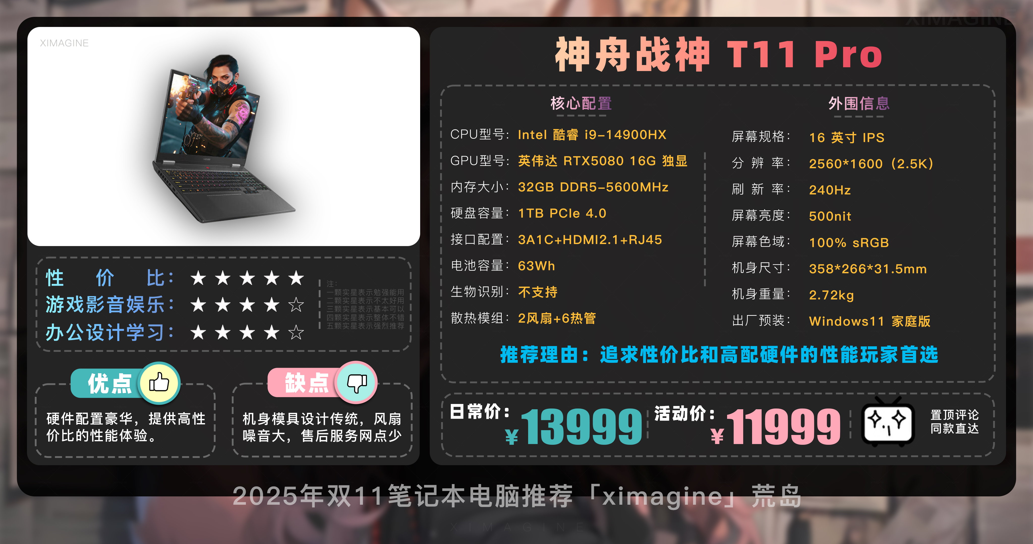 神舟战神 T11 Pro 是配置即正义的代表,它以极具竞争力的价格提供了酷睿i9-14900HX和RTX5080的顶级硬件组合,提供了高性能的解决方案,适合需要强大计算能力进行复杂任务的用户,如科研计算、大规模数据处理或虚拟机测试。然而其外壳模具相对传统,且为了压制强悍的硬件,风扇在高负载下运行声音较大。如果你主要的诉求是核心性能和价格,且不计较品牌、设计和噪音,11999元的它会是一个极具诱惑力的选择。