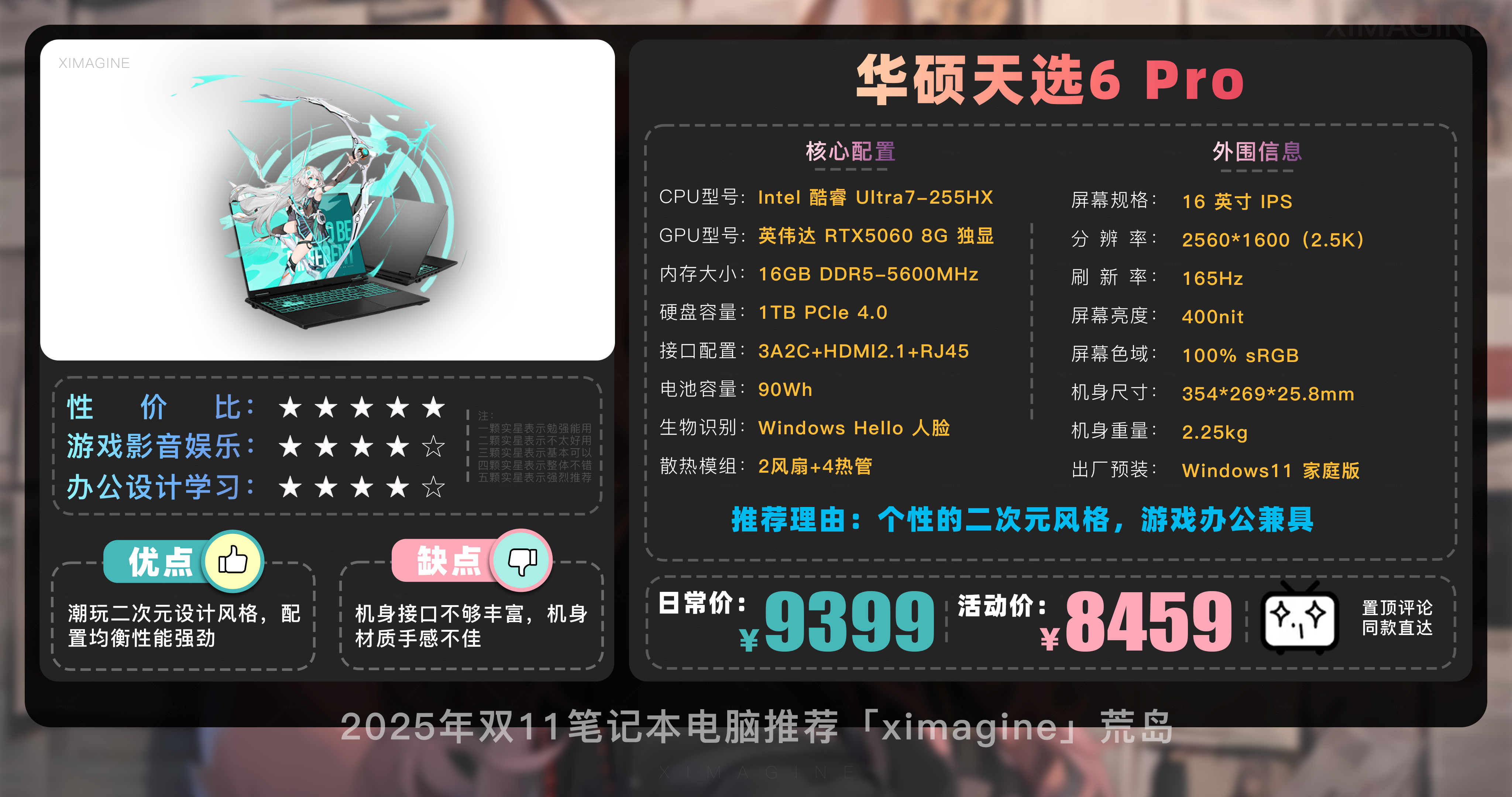华硕天选6 Pro 是一款在性能、续航和设计上都做到良好平衡的全能本,其活泼的二次元外观吸引了年轻用户群体。它搭载酷睿Ultra7-255HX处理器和RTX5060显卡,能轻松应对主流游戏和专业软件。难得的是,它的散热系统在保证性能的同时,风噪控制得比较好。在日常使用中,90Wh电池提供了令人满意的续航能力。8459元的它的适用场景非常广泛,无论是学生在课堂上做笔记,还是下课后进行游戏娱乐,都能提供不错的体验。