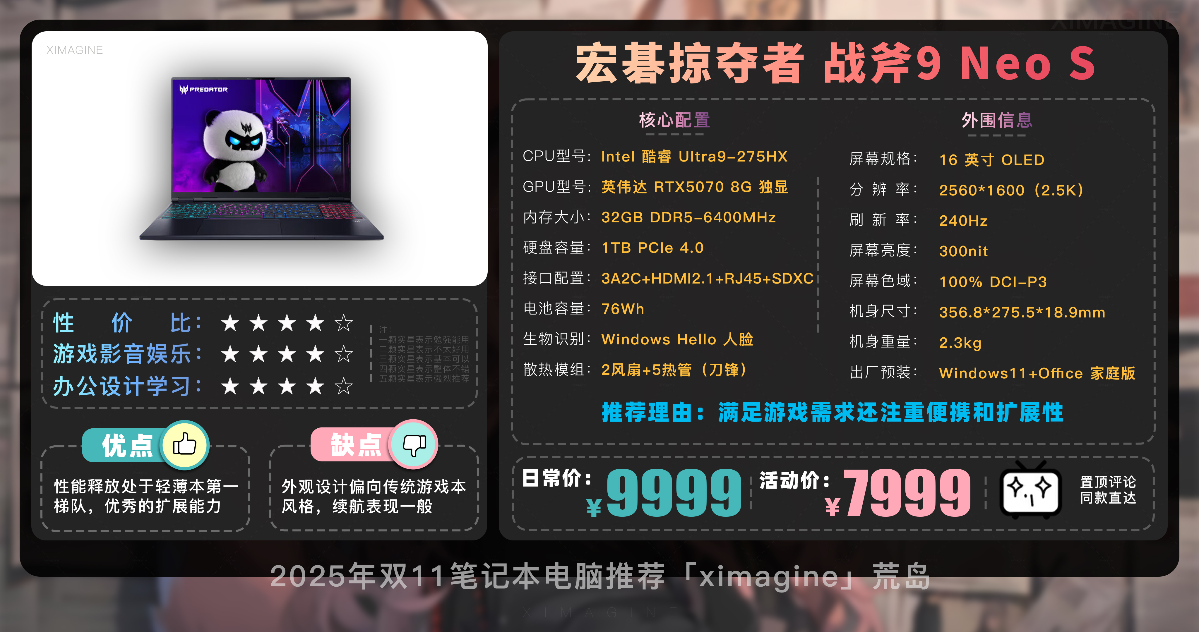 宏碁掠夺者战斧9 Neo S 打破了传统轻薄本的性能界限,在轻薄的机身内提供了同级领先的性能释放。它适合那些对便携性有要求,但又不满足于核显性能,需要RTX5070独显支持的用户,例如偶尔需要玩游戏或运行专业软件的学生或工程师。它的接口配置齐全,扩展性强。虽然外观设计偏向实用而非时尚,且2.3kg重量控制略有妥协,但其性能和实用性使其成为一款高能轻薄工作站的优秀代表。7999元的它是性能党轻薄本的不错选择。