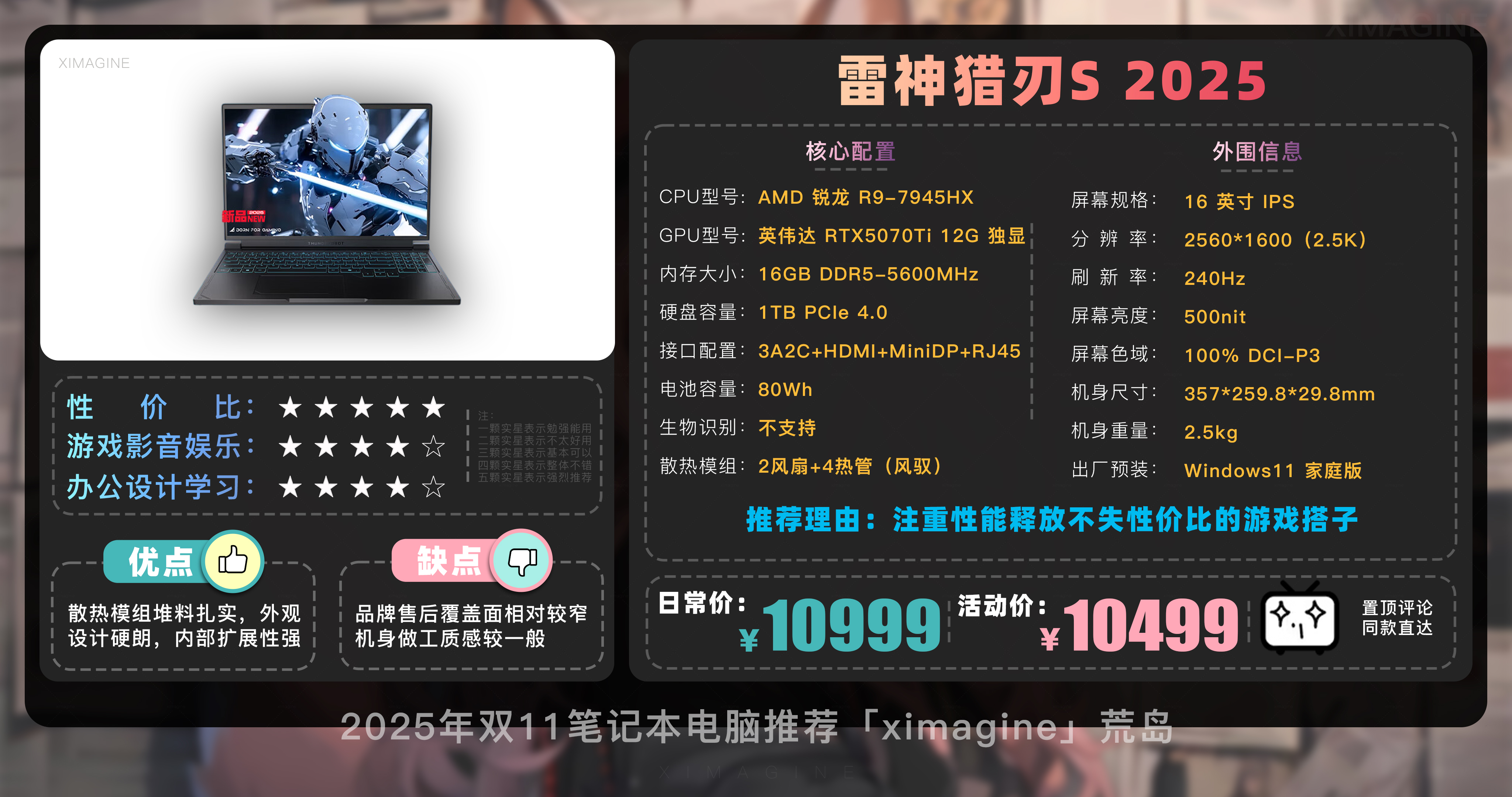 雷神猎刃S 2025 给我的感受是极高的性能性价比。它在核心硬件配置上毫不吝啬,锐龙R9-7945HX搭配5070Ti提供了扎实性能,2风扇加4热管的风驭散热模组,确保性能稳定释放。在实际的游戏测试中,它表现出超出其价位的稳定性和流畅度。机身外观设计硬朗实用,扩展性也做得不错,方便用户自行升级内存和硬盘。虽然在机身的一些细节处理和材质质感上,略逊于一线品牌,但这并不影响其核心的性能体验。10499元的它非常适合预算有限,但对实际游戏性能有较高要求的用户,是一款非常务实的性能选择。