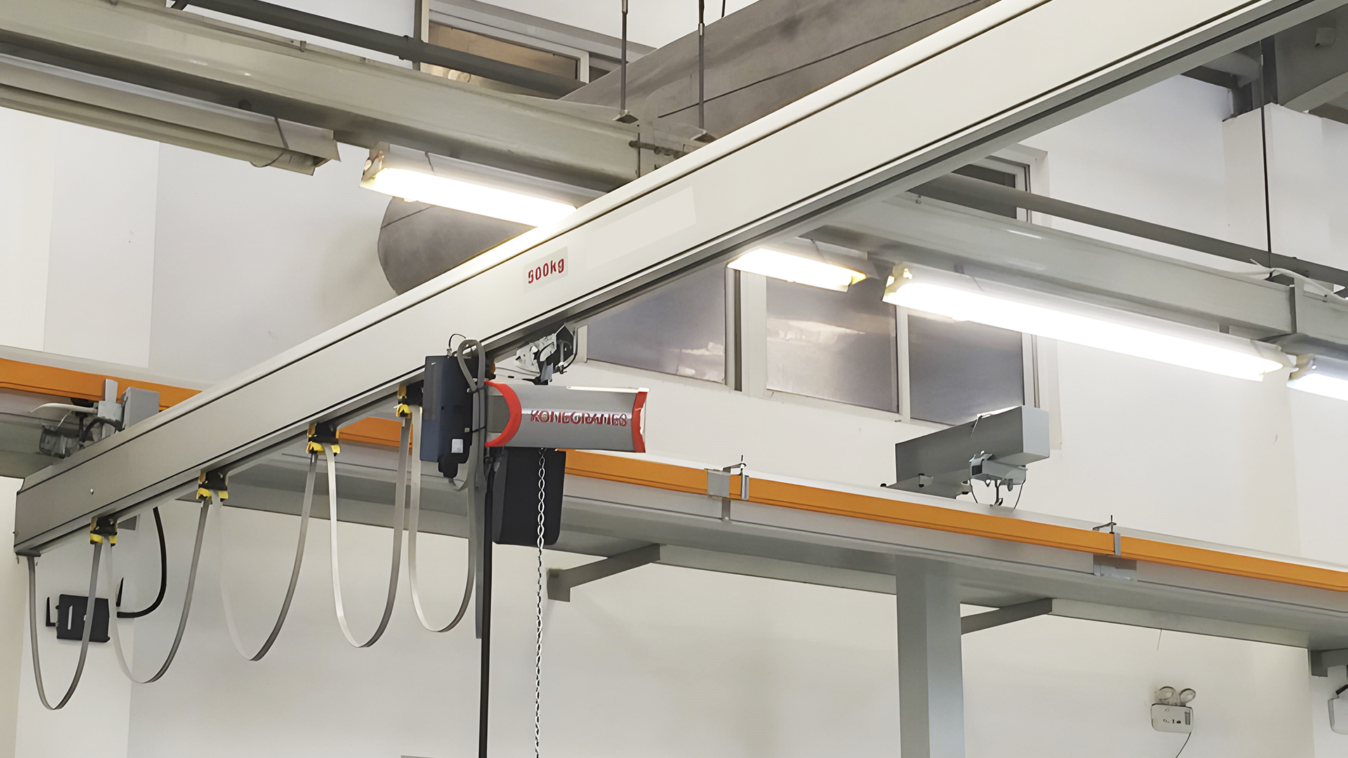 KBK铝制轨道吊机的设计核心是“柔性适配”,打破传统一体化结构束缚。其创新点主要有两处:一是模块化设计,轨道、悬挂装置等部件像“工业积木”可自由拼接,单梁、双梁结构能按需切换,无需整体更换设备;二是轻量化突破,用铝合金替代钢材,自重仅为传统钢轨的30%-50%,却能通过特殊工艺满足几百公斤到2吨的承重需求。这种设计让设备能灵活适配不同厂房布局,狭窄空间或有立柱的场地也能使用。