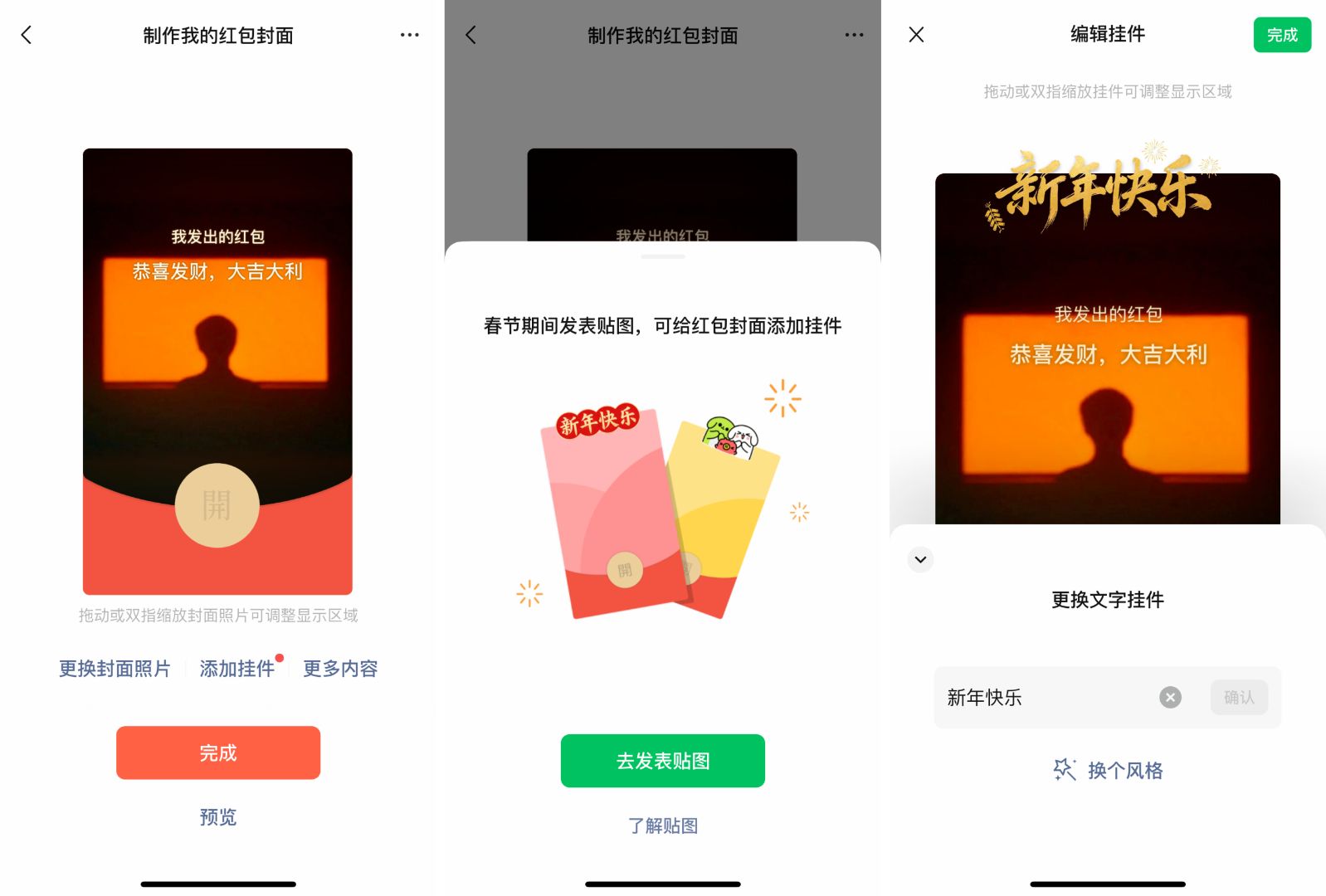 和往年一样,春节期间微信上线了拜年红包。在春节期间发表贴图时,点击制作我的专属红包封面还可以给红包封面增加挂件。在发红包入口选择拜年红包即可使用,可以随机 9.99、8.88、6.66 等吉利金额和祝福,主打节日氛围。