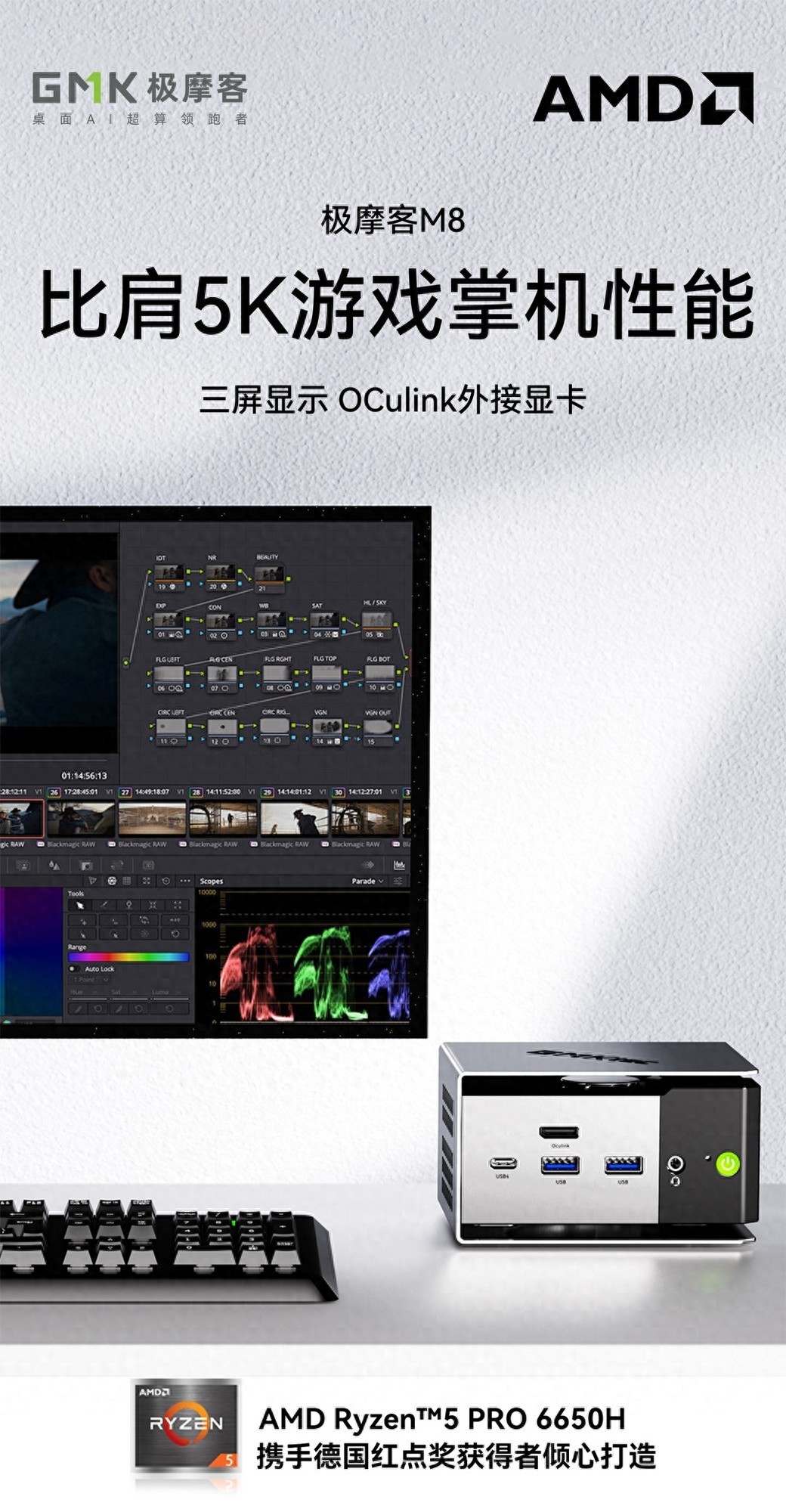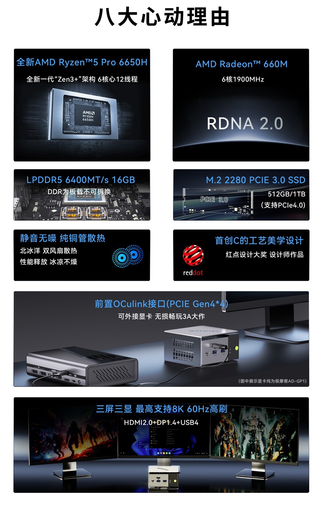 当迷你主机还在妥协性能时,极摩客M8带着AMD Ryzen™5 PRO 6650H处理器、OCuLink外接显卡黑科技与全接口拓展强势而来,以1999元的价格,为追求性能、便携与扩展性的用户带来颠覆性体验。