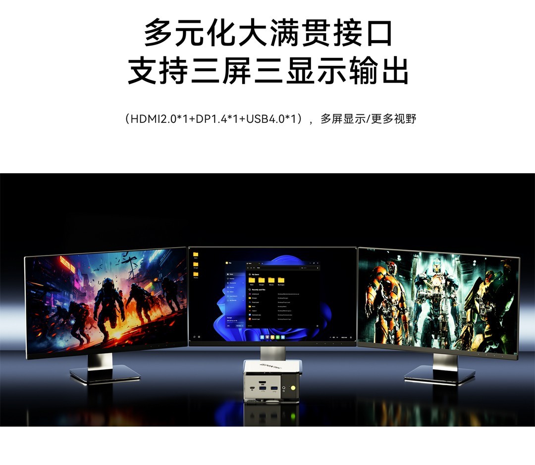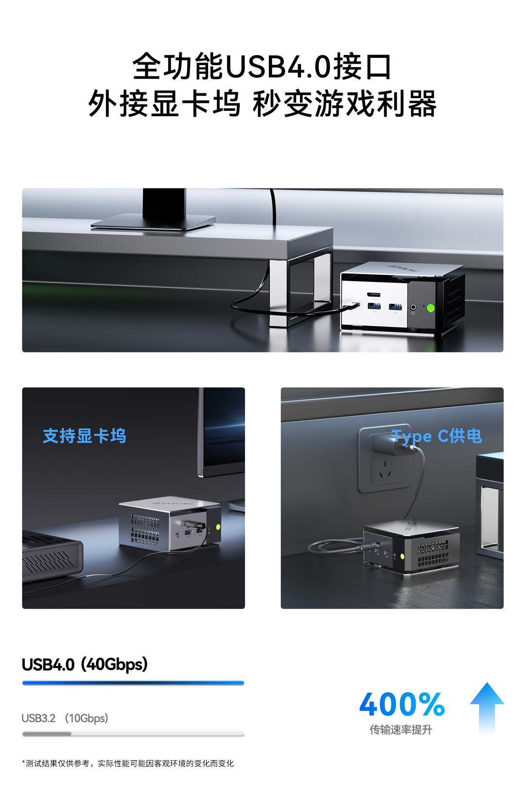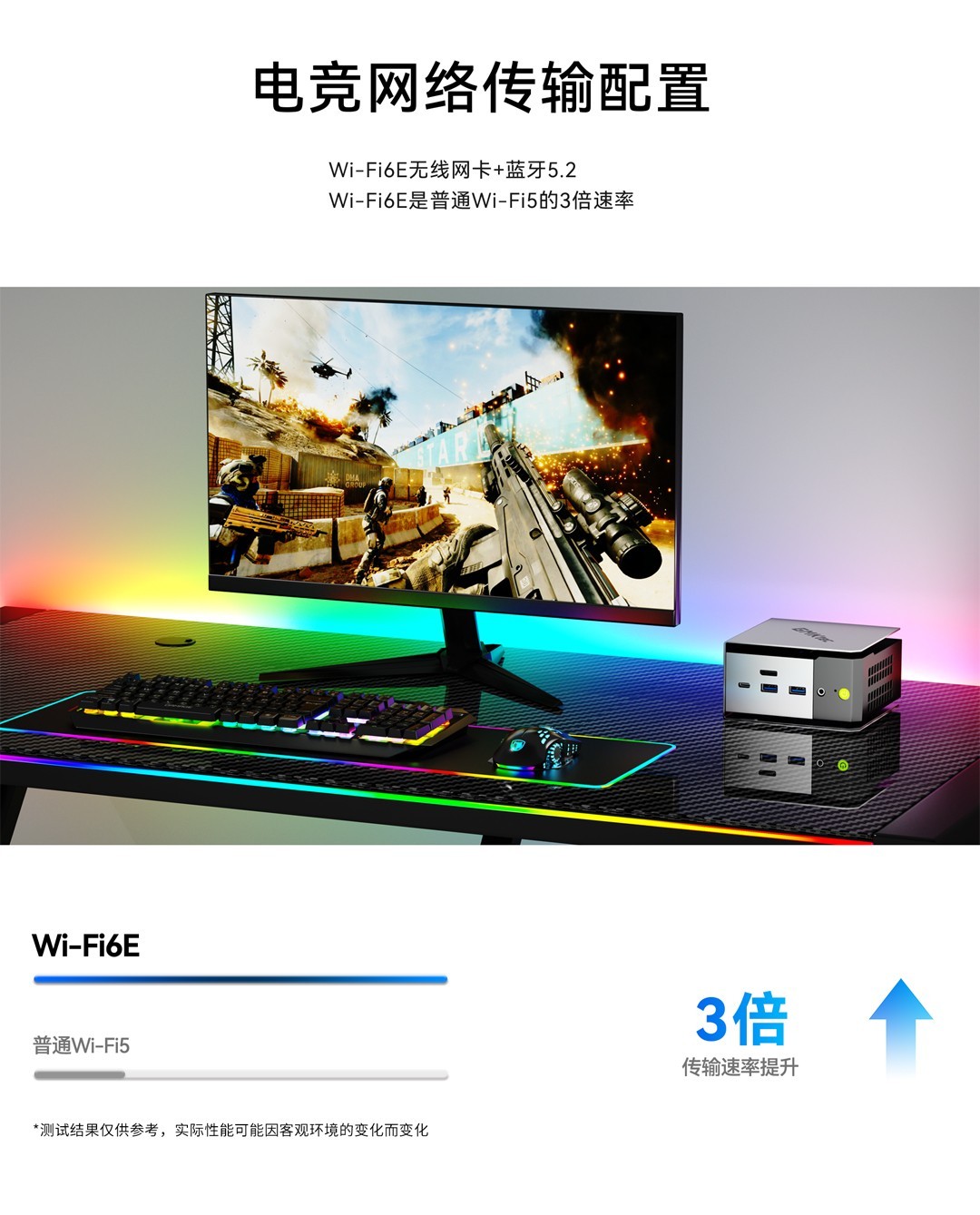 游戏场景:核显可战轻量级游戏,外接显卡坞后更是能畅玩3A大作,Wi-Fi6E保障联机延迟,双网口让下载速度起飞。