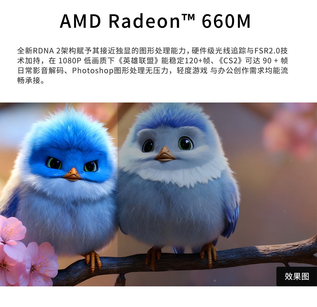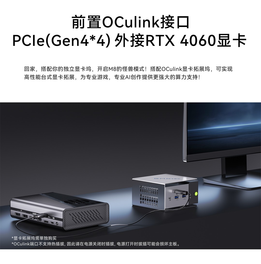 内置AMD Radeon™ 660M核显,基于RDNA 2架构,支持硬件级光线追踪与FSR2.0技术。在1080P低画质下,《英雄联盟》稳定120+帧、《CS2》可达90+帧,日常影音解码、Photoshop图形处理毫无压力。前置OCuLink接口(PCIe Gen4*4),可外接RTX 4060等高性能显卡,瞬间变身“怪兽级”游戏/创作主机,为专业游戏、AI创作提供澎湃算力支持(显卡拓展坞需单独购买)。