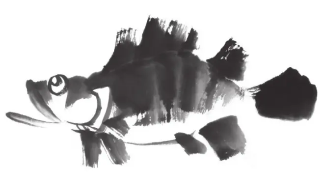 3、取浓墨侧锋铺染鱼身,通过墨色浓淡渐变呈现鳞片层次,强调体块结构的立体感。