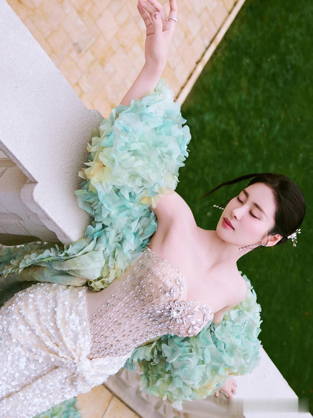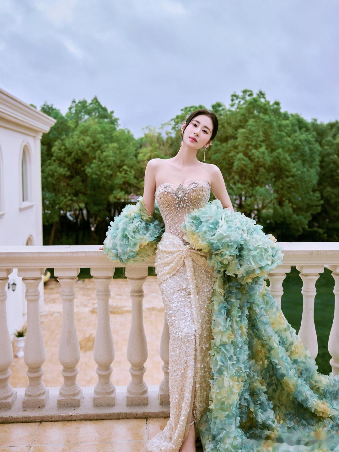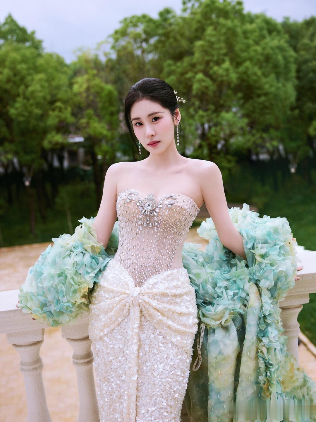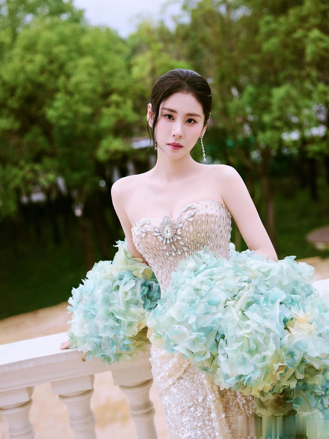 张碧晨,一身钻石裸色长裙,足够的优雅柔美。