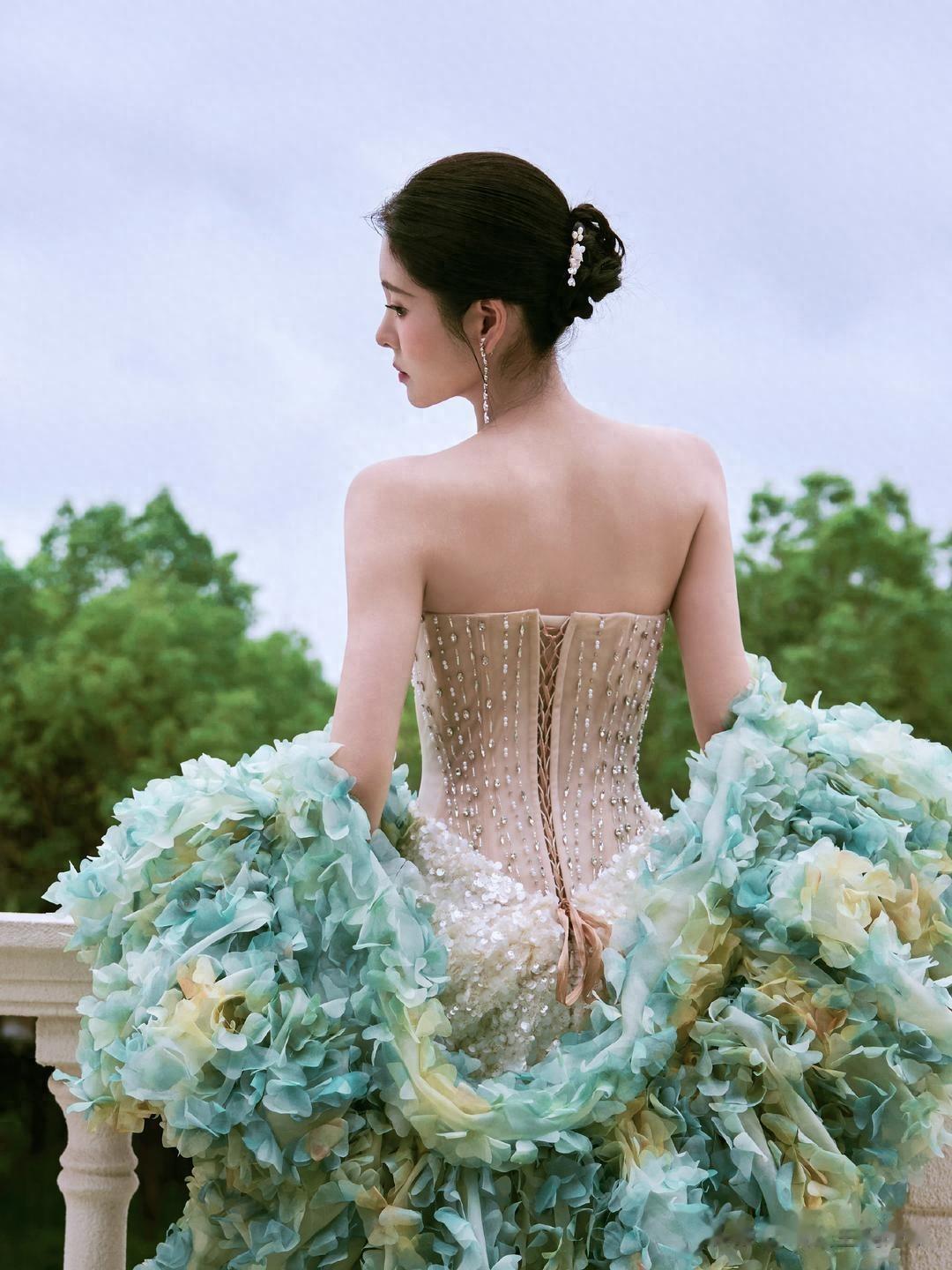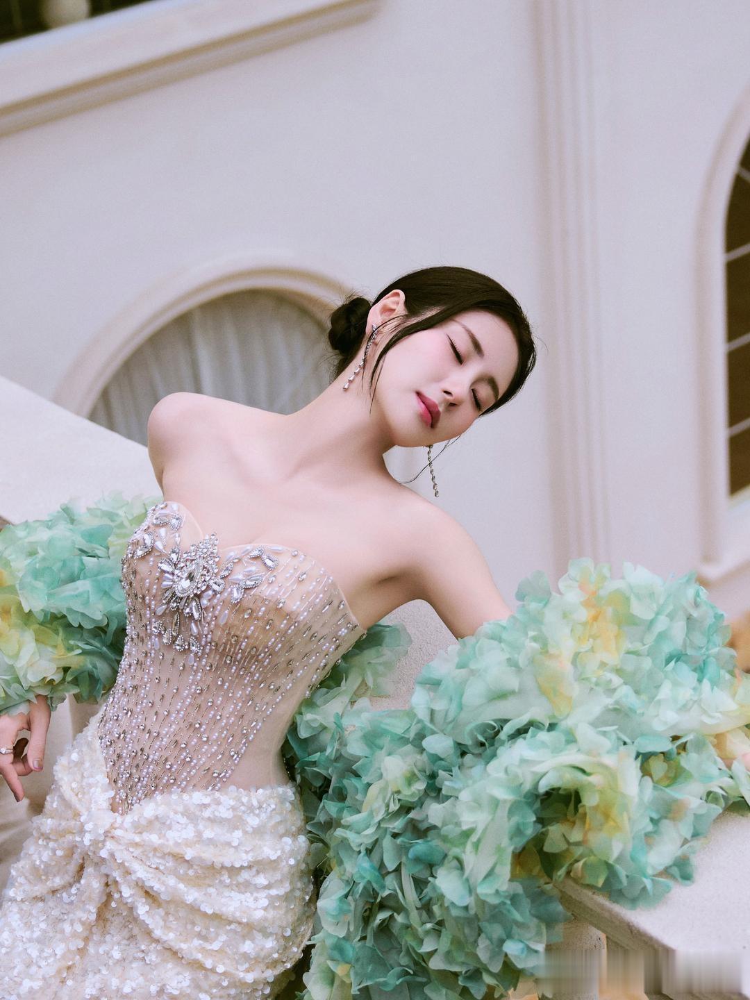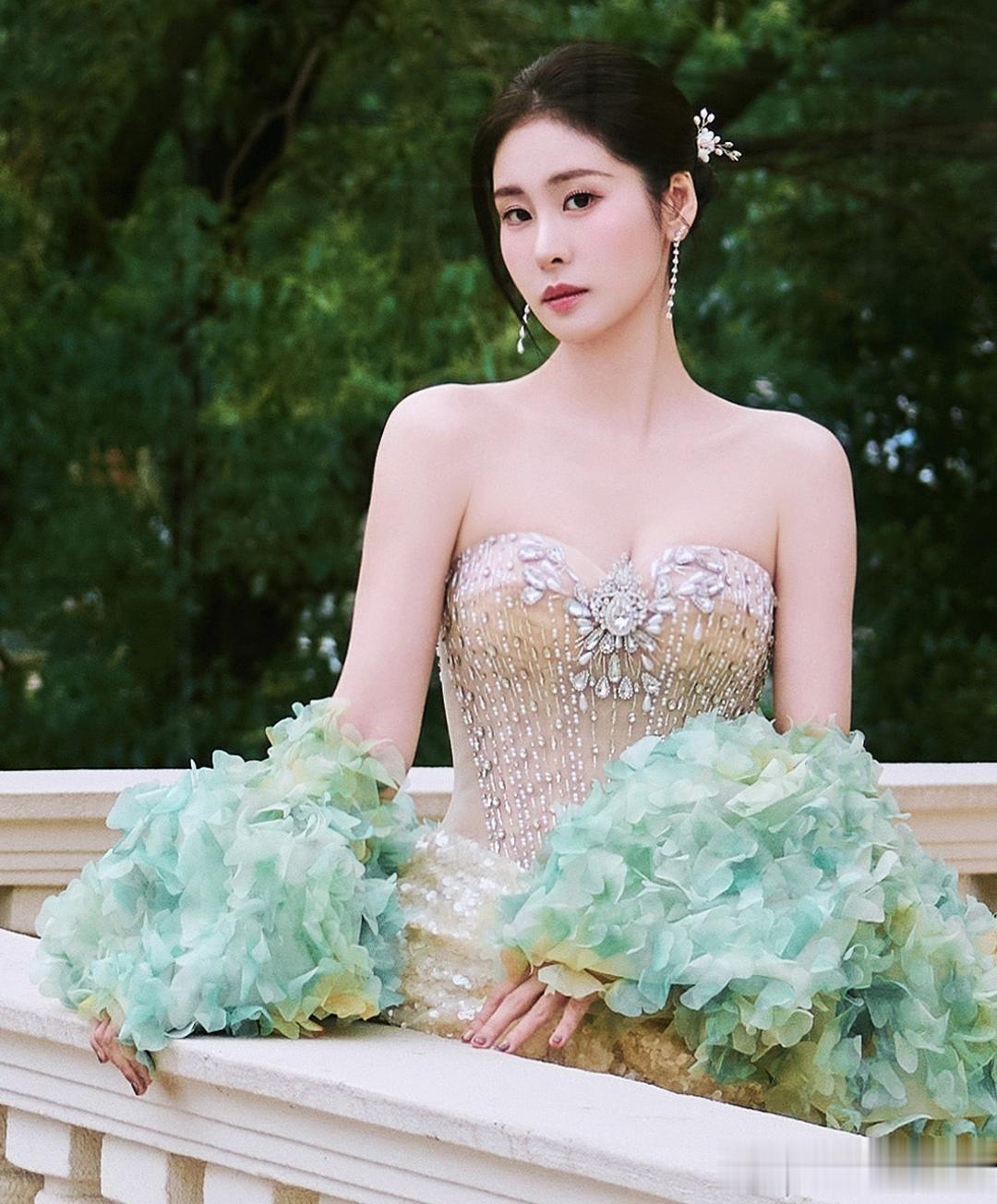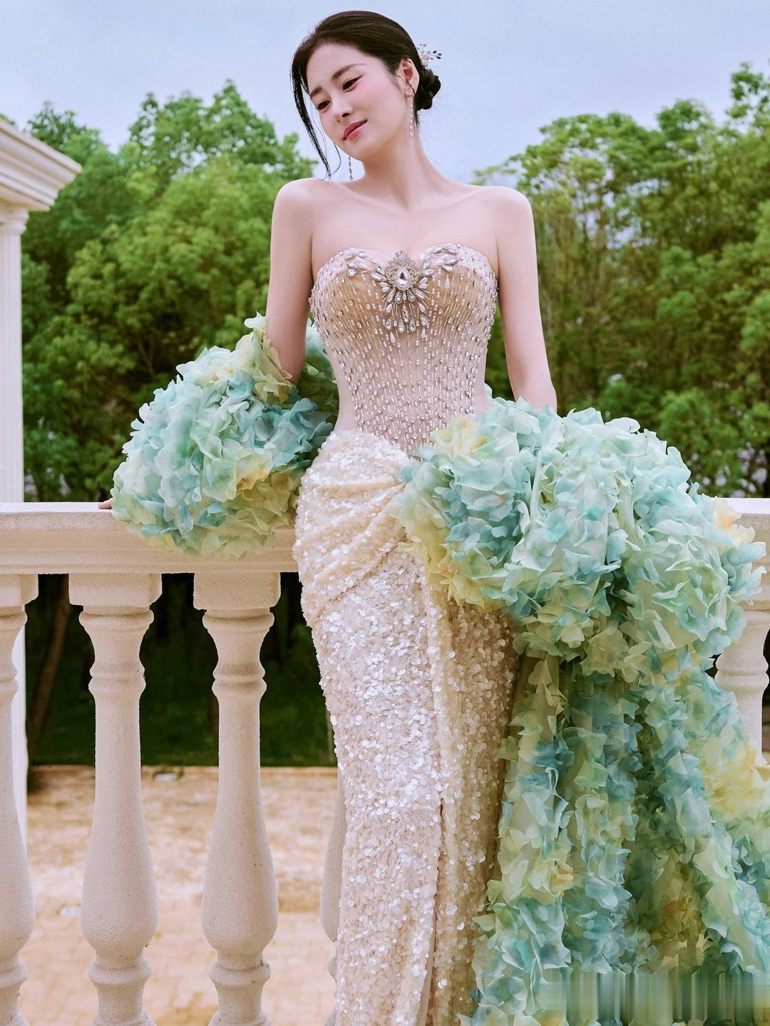 张碧晨,一身钻石裸色长裙,足够的优雅柔美。