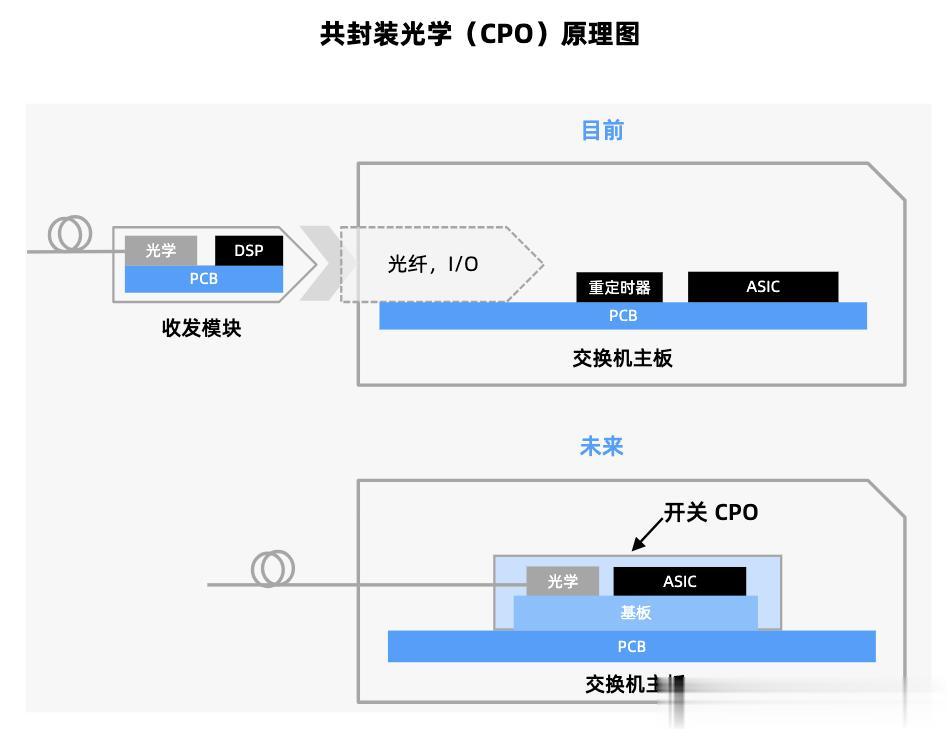 NPO光引擎独立于交换芯片,通过短距PCB走线连接,保留了光引擎的可插拔特性,降低了对主芯片SerDes驱动/均衡能力的要求。CPO光引擎与交换芯片深度集成,需重新设计芯片架构,对系统兼容性要求更高。