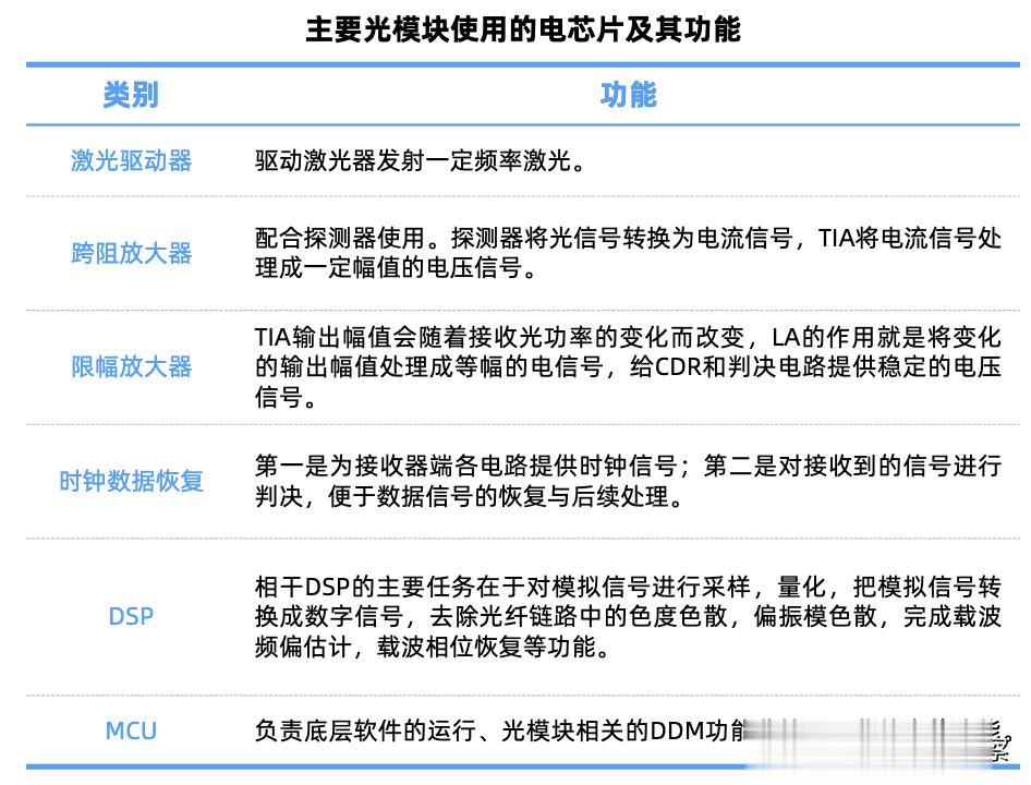 电芯片包括LD driver、TIA、DSP等,主要用于光模块的信号驱动与处理。