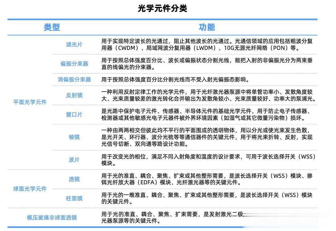 此外,无源器件陶瓷套管、插芯、FAU(光纤阵列单元)等用于光信号的精准传输与耦合。天孚通信、太辰光等为代表的厂商在光学元件领域具备全球竞争力;致尚科技光纤连接器全系列覆盖;在光学元件厂商中,东田微已实现全系100G滤波片、非球管帽量产。