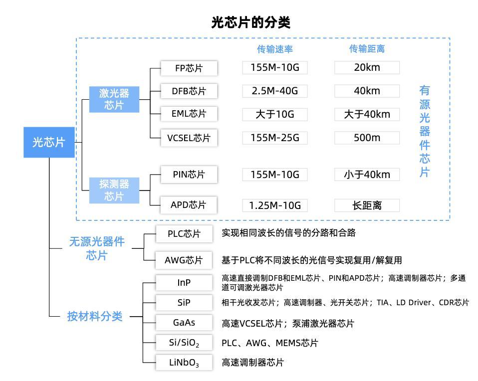 光芯片分为有源器件芯片和光无源器件芯片。