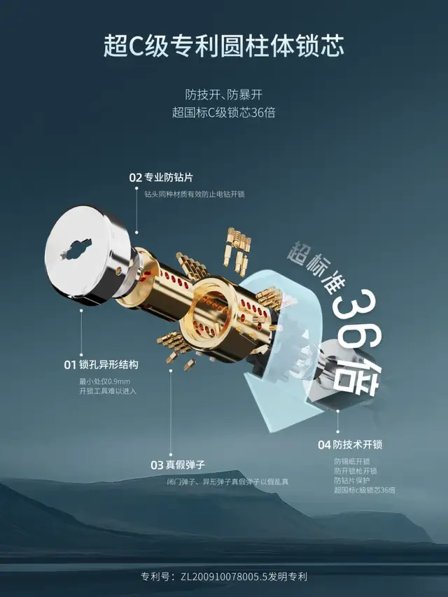 在硬件方面,产品采用超C级圆柱体锁芯,防技术开启时间达到360分钟,远超国家C级标准36倍。外部采用高强度不锈钢全包裹设计,内部嵌有特制防钻片与防钻销,结合真假弹子及二次锁定机制,构建起坚固的机械防护线。同时,产品具备关门自动上锁功能,有效杜绝忘记锁门的风险。