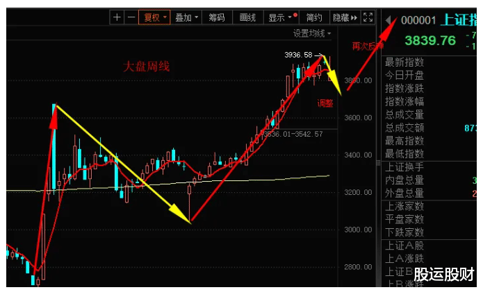 大家看,从周线从2700点启动上涨到3600点后回调,然后在3000点再次启动上涨到4000点