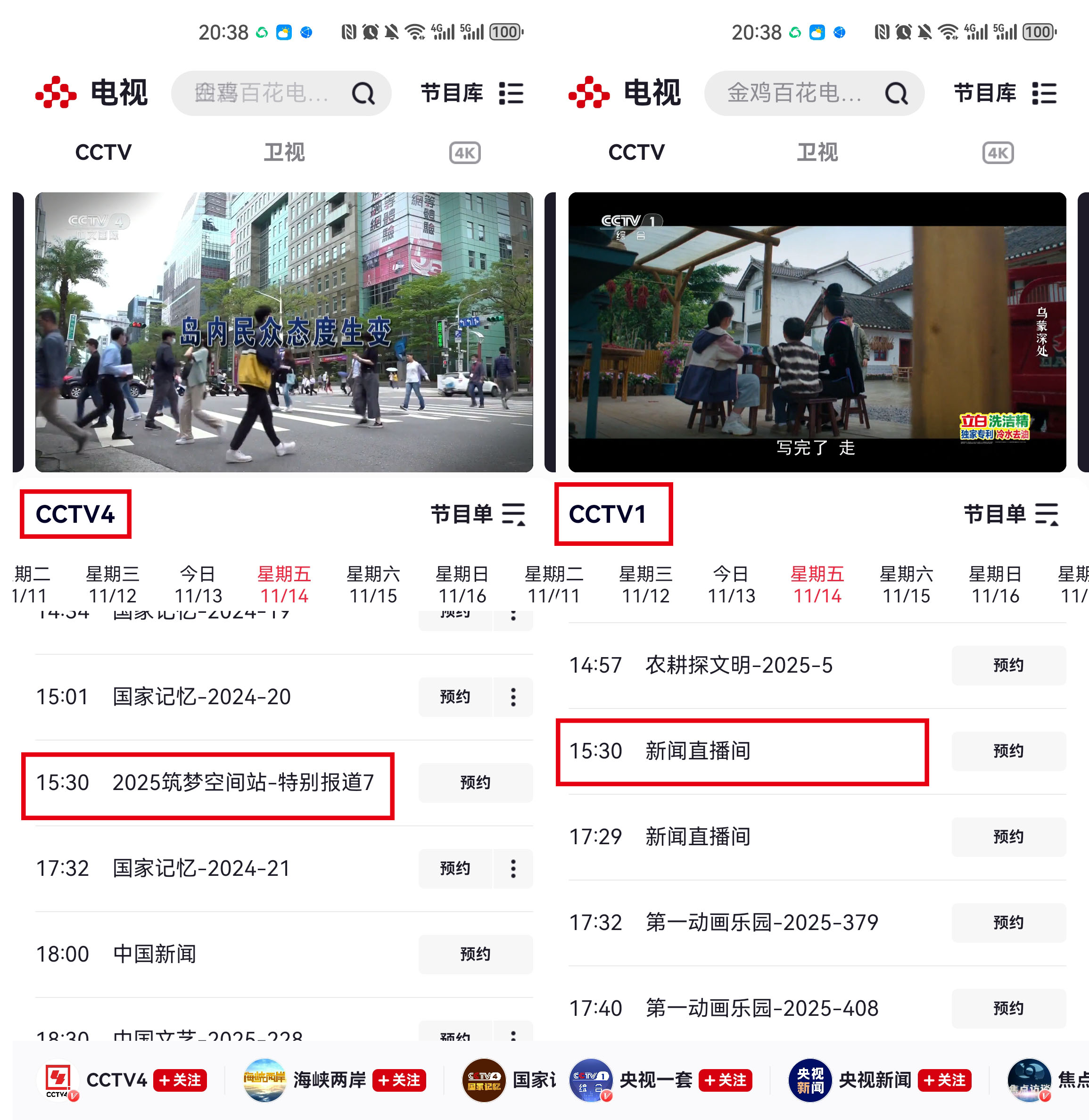 二个是来自于央视节目单。在CCTV1套和CCTV4套14号下午时间段的安排都有点特殊。一般一套节目这个时间段都是电视剧的,但节目单列出安排的则是“新闻直播间”节目,而CCTV4给出的节目单就更加明晰一些了,节目显示为“2025筑梦空间站特别报道-7”。这就不得不让圈叔有点小兴奋了,看来神舟二十号的英雄航天员就要回来了,但是也不排除是空船返回的可能。