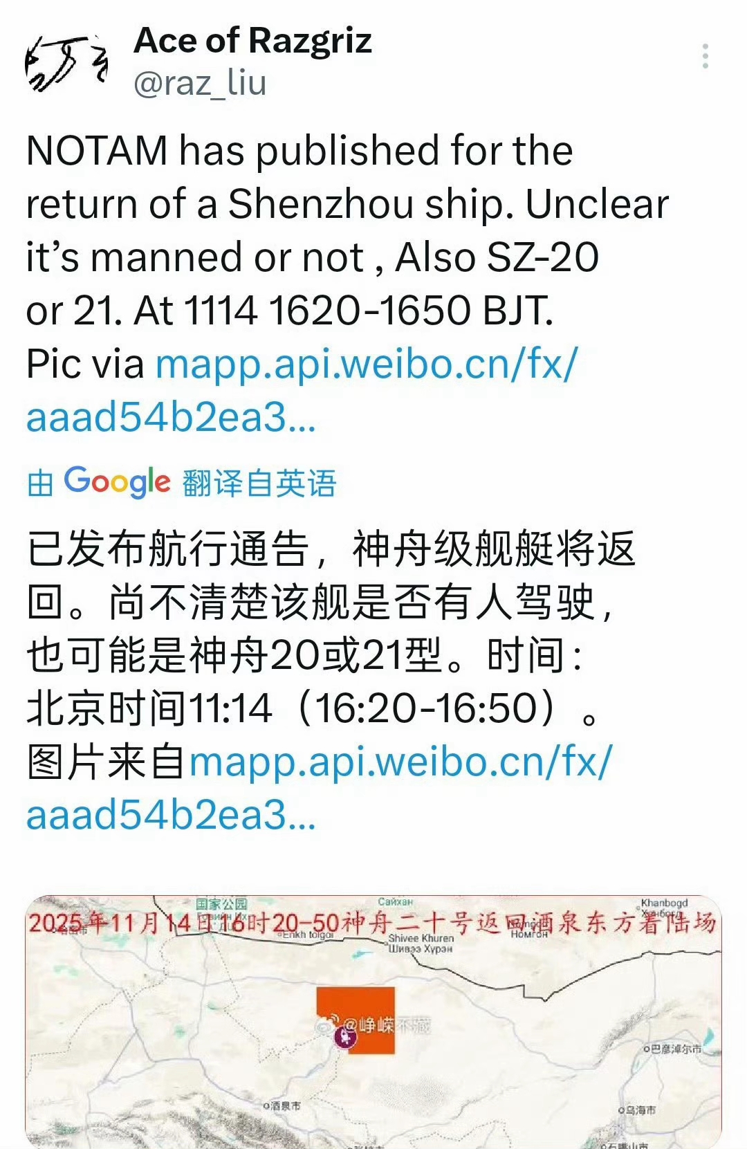 很可能神舟二十号乘组将会在11月14日下午返回着陆场。得出这一猜想的出处是两个。一个是来自于一则外网预测,在这个时间段是窗口期,将会有飞船落地。