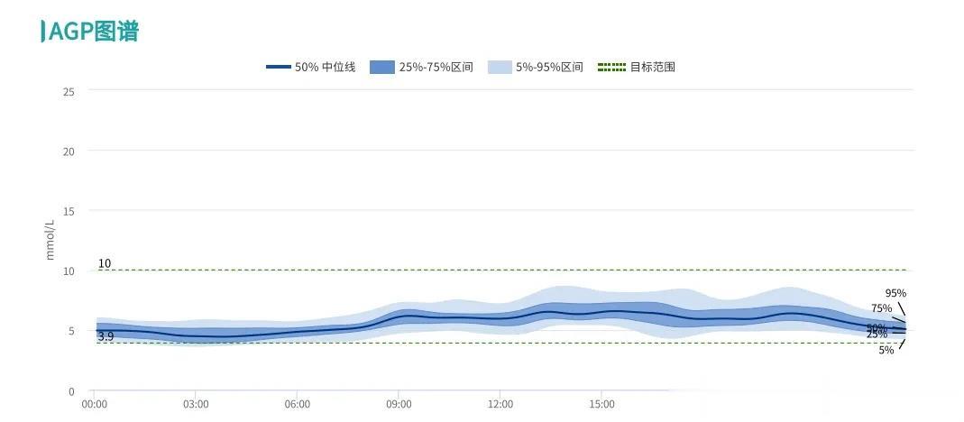 为更全面了解血糖动态变化佩戴动态血糖监测2周,如上图所示TIR(葡萄糖在目标范围内时间)95.7%,TBR(葡萄糖低于目标范围时间)4.1%,TAR(葡萄糖高于目标范围时间)0.2%,预估糖化血红蛋白(eHBA1c5.23%),平均葡萄糖值(MG)5.68mmol/L,葡萄糖标准差(SD)1.19mmol/L,变异系数(CV)20.96%,除TBR(葡萄糖低于目标范围时间) 4.1%高于正常外(对于普通糖尿病患者应该尽量避免发生低血糖,此数值不能太低),其他指标接近正常水平。
