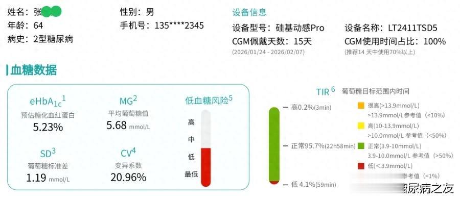 这是一位有着21年糖尿病病史的64岁“老糖友”——老张,他的近期动态血糖监测结果如下: