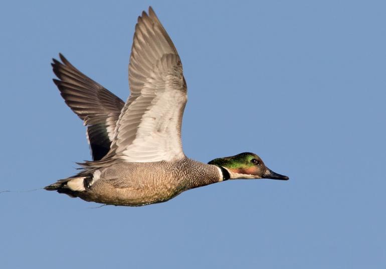 与雄鸟的华丽截然不同,雌性罗纹鸭通体呈暗褐色,杂有浅色斑纹,这种低调的保护色,能让它们在芦苇丛和浅滩中完美隐藏,尤其在孵化和育雏期间,是保障生存的关键。而眼前这只雄鸟,显然正处于最佳状态,它的三级飞羽延长并向下弯曲,呈镰刀状,这也是它英文名“Falcated Duck”的由来,此刻正随着它的动作微微颤动。