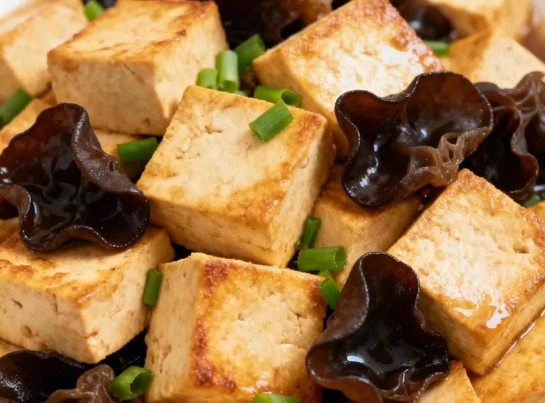 老豆腐切成小块,放入热油中,煎至两面金黄,盛出备用;木耳泡发撕成小朵,香菇切片。