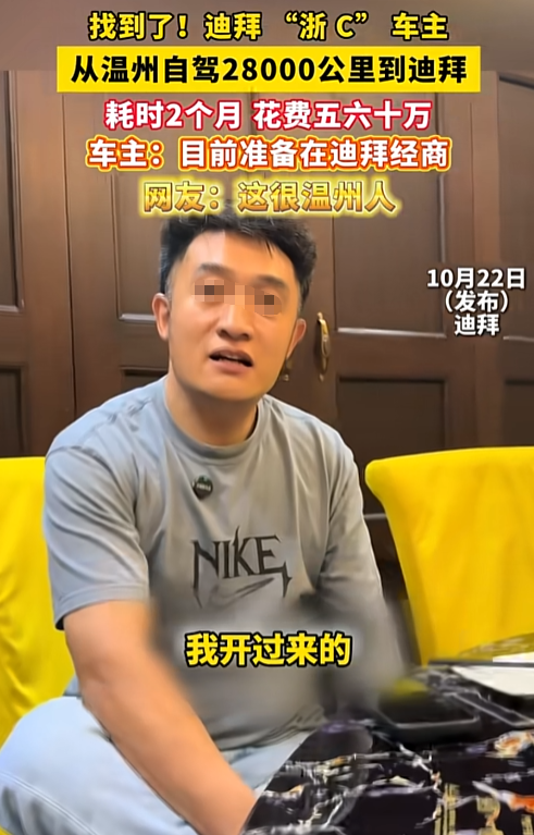 在迪拜生活了十年的牛女士最近惊了——路上撞见一辆蓝底白字的浙C牌照越野车!这可是迪拜街头罕见的“中国符号”。车主张正明是湖北十堰人,在温州做了15年生意,因近年生意遇困,他索性关了店,开着自家浙C车从新疆霍尔果斯口岸出境,花了50天、跑了2万多公里,穿越哈萨克斯坦、阿塞拜疆、伊朗,最终在7月抵达迪拜,准备在此开启汽车改装生意。