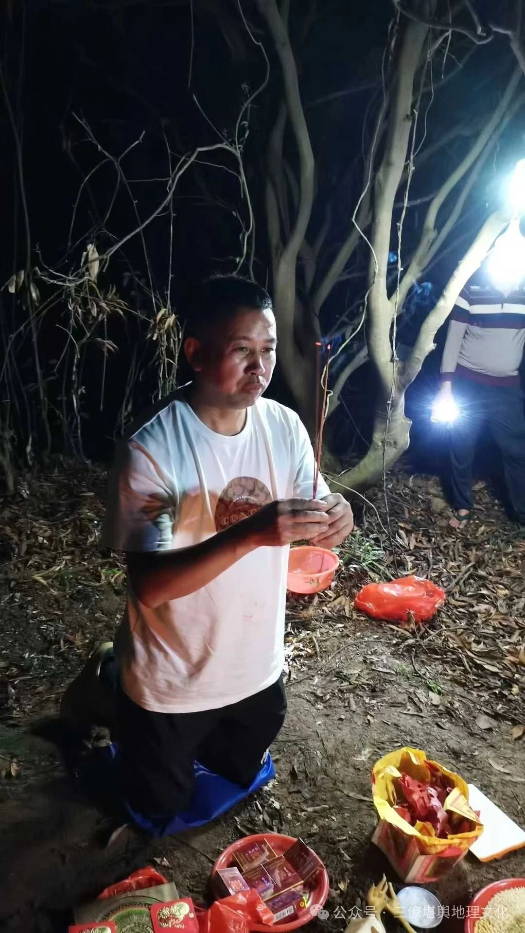 仪式有序展开,焚香、祭拜,每一个动作都饱含敬意。人们以传统的方式,向天地、向自然传递内心的祈愿,期望生基破土能为往后岁月带来吉祥如意。手中的香烛燃起袅袅青烟,仿佛将美好愿景捎向天际,身旁的伙伴协同配合,让这份庄重与虔诚,在夜色中愈发浓郁。
