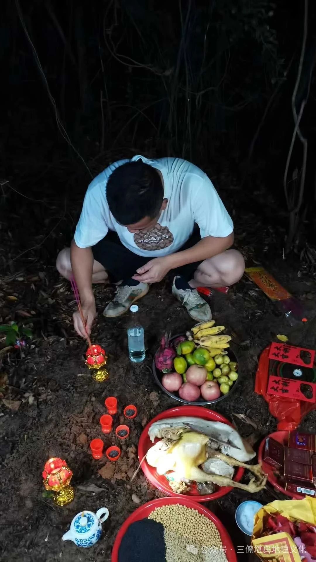 夜幕笼罩下,山林间透着静谧与庄重。选好的吉时一到,参与仪式的人们带着对未来的期许,齐聚于选定之地。月光与灯光交织,照亮了摆满祭品的一方天地,水果色泽鲜亮、五谷充盈饱满 ,它们静静等待,为这场民俗仪式添上质朴而虔诚的注脚。