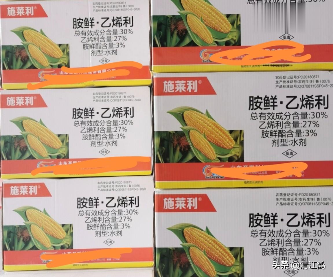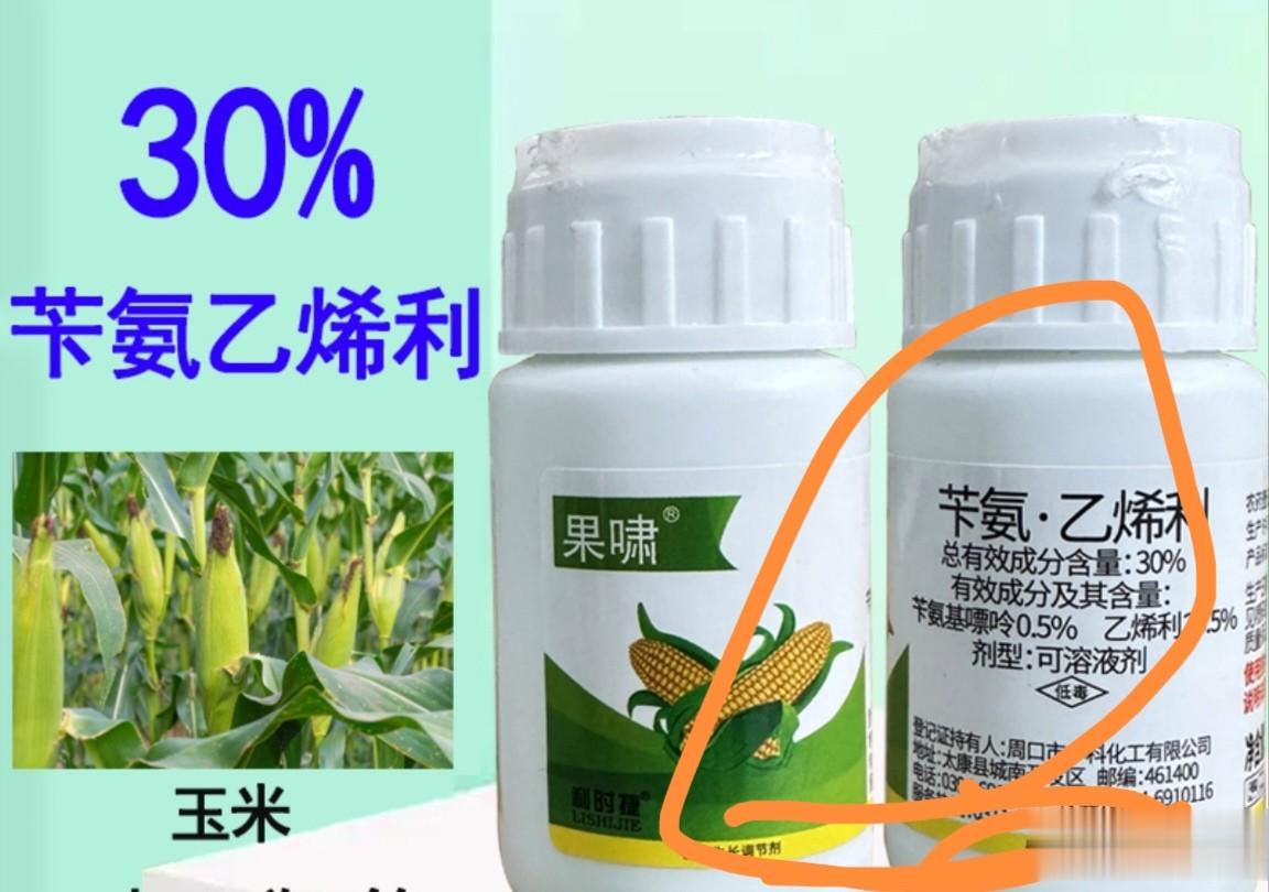 能缩短玉米基部节间,控制玉米倒伏的植调剂复配制剂30%苄氨乙烯利可溶性液剂:通过田间试验示范,在玉米植株6~10叶期的时候,给玉米植株喷施30%苄氨乙烯利可溶性液剂25~30毫升/桶水茎叶处理,即可使玉米植株“矮缩”,茎基部变粗“增粗”。