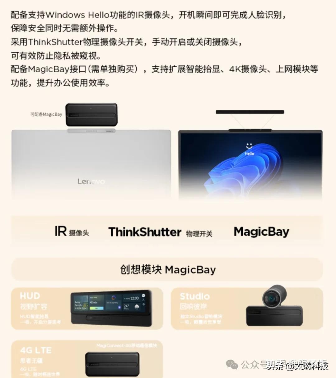 ThinkBook 14+/16+ 2026还有一个特色是都支持了 MagicBay,之前只有ThinkBook 16p、ThinkBook X这些高端机型才支持MagicBay。通过这个功能可以外接各种模块,实现更丰富有趣的功能。同时两款机型都支持人脸识别。