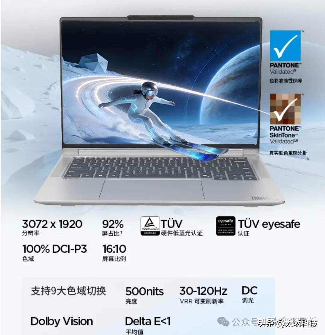 下面分开说ThinkBook 14+/16+ 2026的屏幕和处理器。ThinkBook 14+ 2026屏幕与2025款一样,是14.5英寸16:10的3K分辨率,120Hz刷新率,100%DCI P3广色域,500尼特高亮度,屏占比提升到92%。支持9大色域切换。色准Delta E小于1。这是一块相当高水准的IPS护眼屏幕,在现在很多品牌都在强推OLED屏的时候,ThinkBook却选择一块顶级的IPS屏是很难得的,毕竟IPS屏确实要比普通OLED屏更护眼。