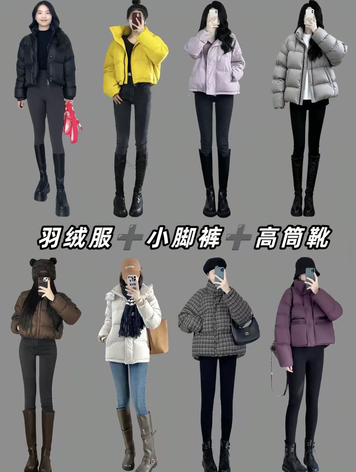 短羽绒搭小脚裤配高筒靴,冬日显瘦显高穿搭公式get