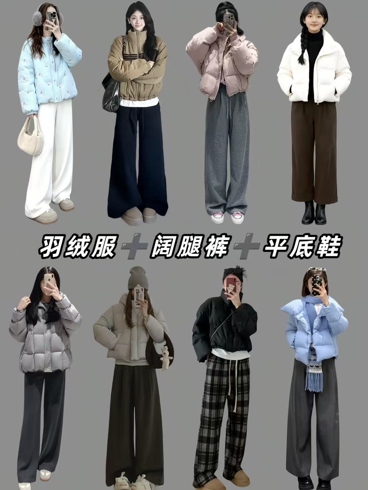 短羽绒配各色阔腿裤搭平底鞋,冬日舒适又时髦的穿搭