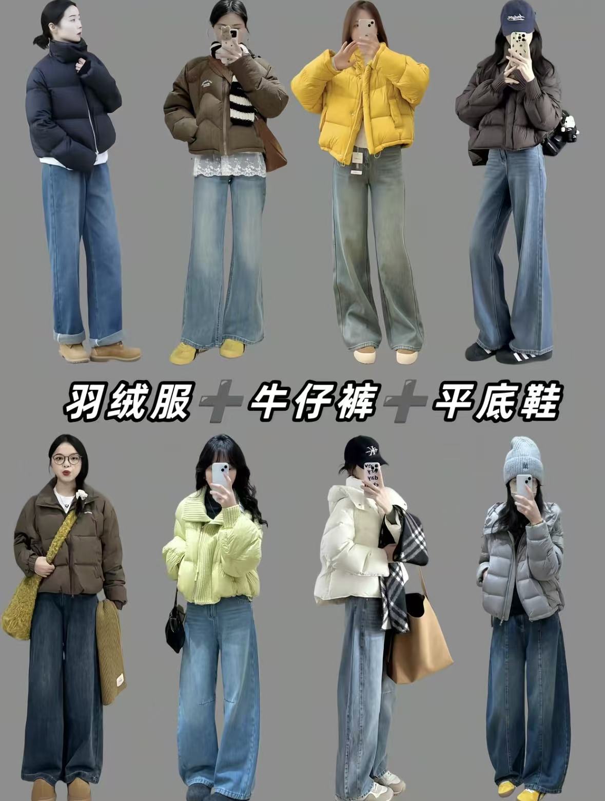 短款羽绒搭阔腿牛仔,平底鞋解锁冬日松弛感